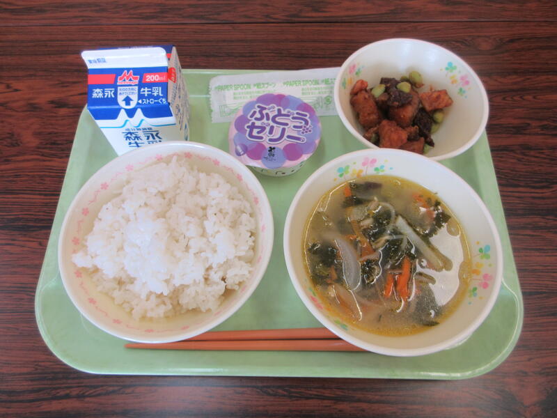 本日の献立は、麦ごはん、牛乳、チンゲンサイの中華スープ、魚とレバーのチリソースがらめ、ぶどうゼリー です。