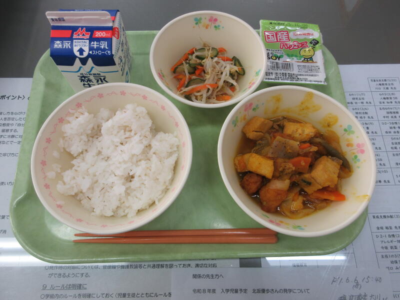 今日の献立は、麦ごはん、牛乳、さつま汁、さばのカレーしょうゆ漬け、野菜の梅まよ和え です。