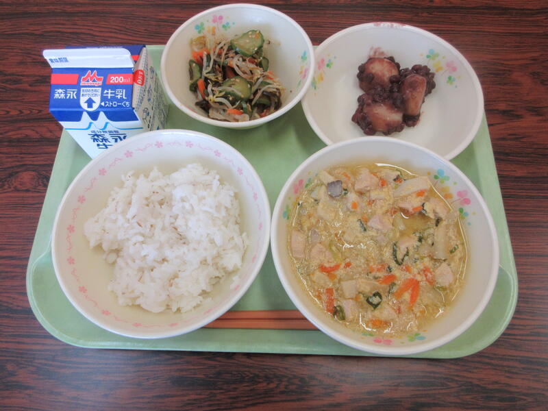 本日の献立は、麦ごはん、牛乳、さつま汁、いわしの梅煮、ほうれん草のおかか和え です。