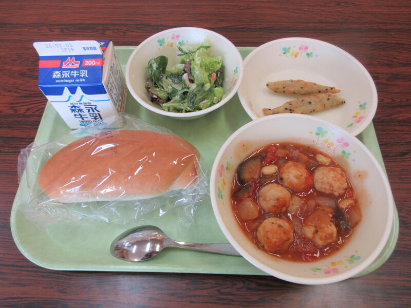 今日の献立は、コッペパン、牛乳、なすとミートボールのトマト煮、天草産きびなごフライ、益城町のお野菜サラダ です。