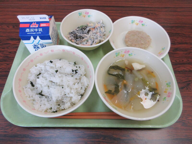 今日の献立は、わかめごはん、牛乳、冬瓜スープ、キャベツ入りつくね、ひじきポテトサラダ です。