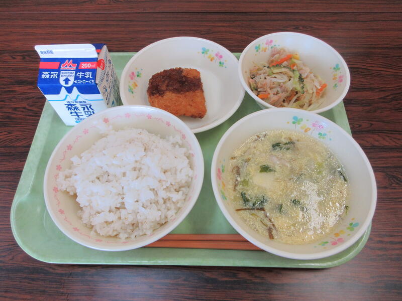 本日の献立は、麦ごはん、牛乳、かきたま汁、ソースカツ、ゴーヤとツナのサラダ です。
