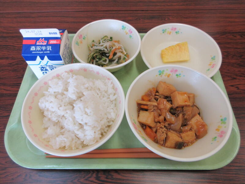 今日の献立は、麦ごはん、牛乳、チャージャン豆腐、もやしとにらのナムル、パイン です。