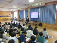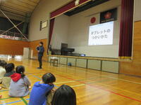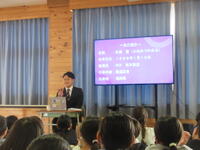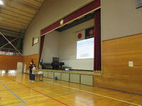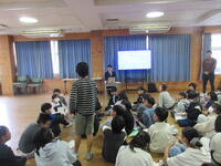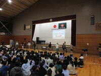 次に、清田先生が「KAMI技・グランプリ」を紹介しました。このグランプリは上益城郡内の小学生が、縄跳びで競ったり交流したりする取組です。最後には体育委員会のみんなが短縄のデモンストレーションを見せてくれました。