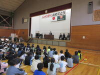 その後の始業式では、新しく3人のお友達が転校してきましたので、みんなでお迎えしました。式では、4年濵田あいさん、5年島田こうさん、6年柄澤かなさんが、今年の目標を発表してくれました。