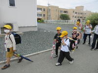 ランドセルにつけているリボンの色ごとにグループで下校します。今日はピンクリボンのみんなと歩きましたが、3年生のお兄さんがしっかりリードしてくれて頼もしかったです。