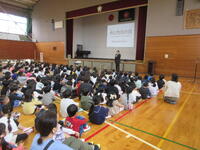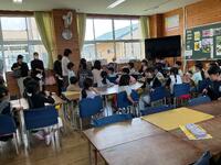 まず3年生が実際に自転車の安全な乗り方について学びました。1・2年生は正しい道路の歩き方を教えていただきました。今年は県道高森線4車線化に伴い、「18m横断歩道」をつくり安全な渡り方を体験しました。4~6年生は、体育館で「青切符」に関連する自転車ルールをDVDで学数しました。