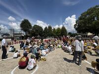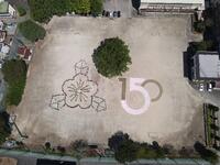 また、150周年に向けて、全校生徒で航空写真撮影を行いました。前日に、球磨工業高校の生徒さんと150周年記念事業実行委員会の方々に御協力をいただき、測量で150という文字と校章を描いていただきました。初めてのドローン撮影にわくわくしている様子の子供たちでした。