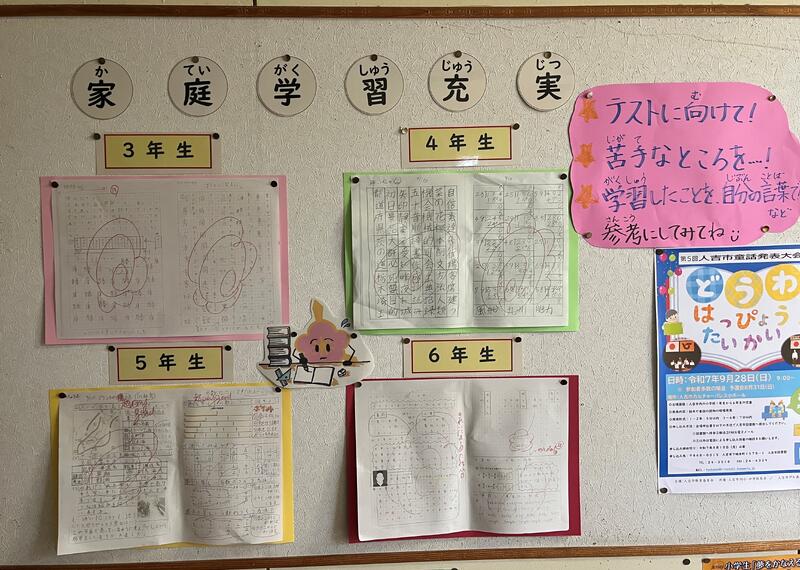 それぞれの学級で、毎日、自主学習に取り組んでいます。その日の復習や、テストで間違えたところをもう一度やってみる、校内計算大会に向けて計算練習をする、など、工夫して取り組んでいます。3年生以上のノートを廊下に掲示しているので、参考にして中身の充実した学習になればと思います。