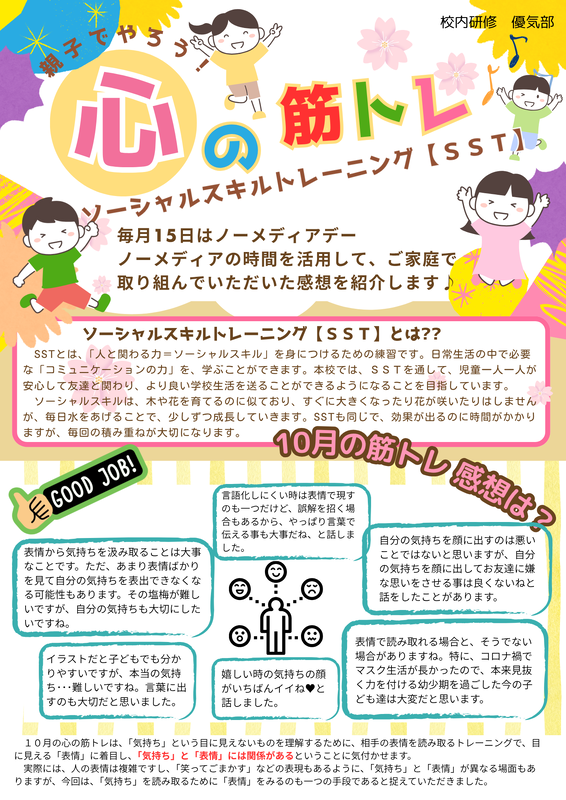 10月のSSTは、「気持ち」という目には見えないものを理解するために、相手の表情を読み取るトレーニングでした。