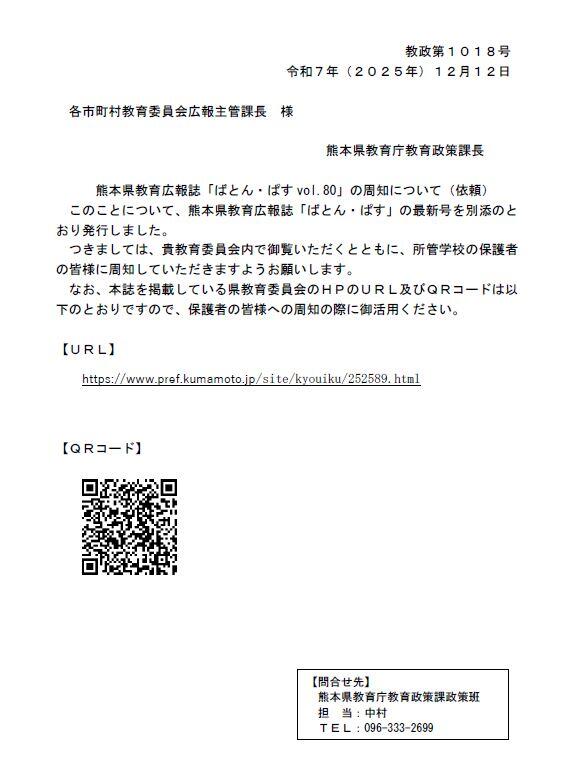 熊本県教育広報誌「ばとん・ぱすvol.80」について
