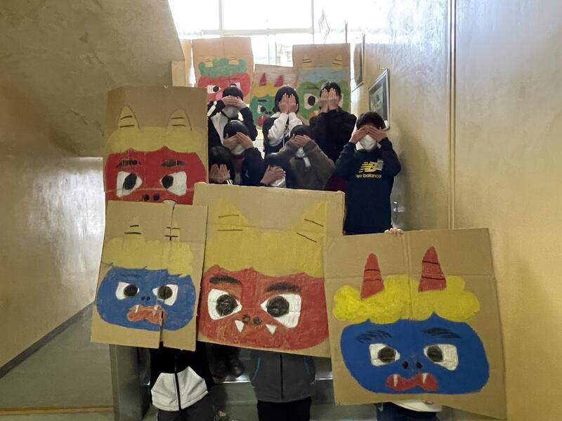 何も聞かされていなかった1年生でしたが、担任の先生から渡された鬼を退治するための豆(新聞紙で作った玉)を受け取ると、元気よく鬼に投げつけていました。