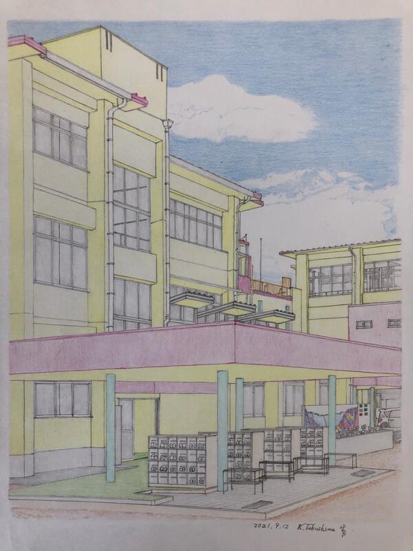 思いのこもった校舎の色鉛筆画