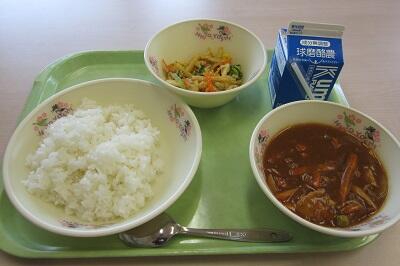 16日(月)の給食は、白ごはん、牛肉と大根のべっ甲煮、ひじきと豆のサラダ