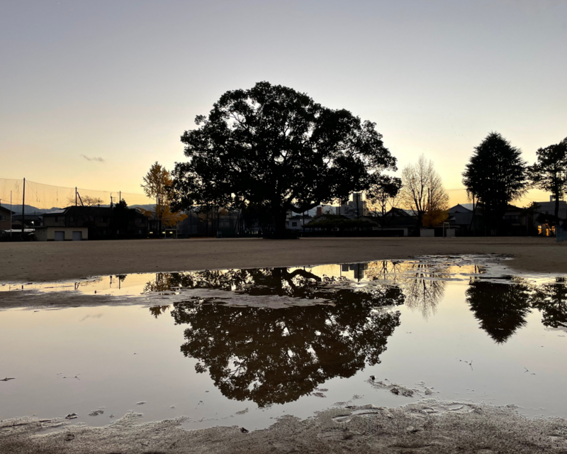 夕方運動場に出ると、その水たまりに綺麗な逆さクスノキが映っていました!