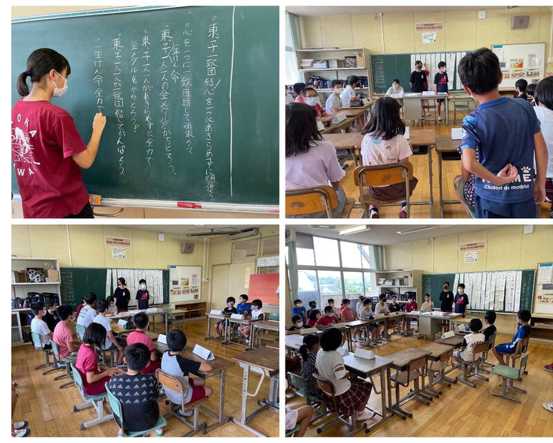 東小の全学級から出された案の中から、スローガンに入れたい言葉を選び、それを組み合わせて作りました。