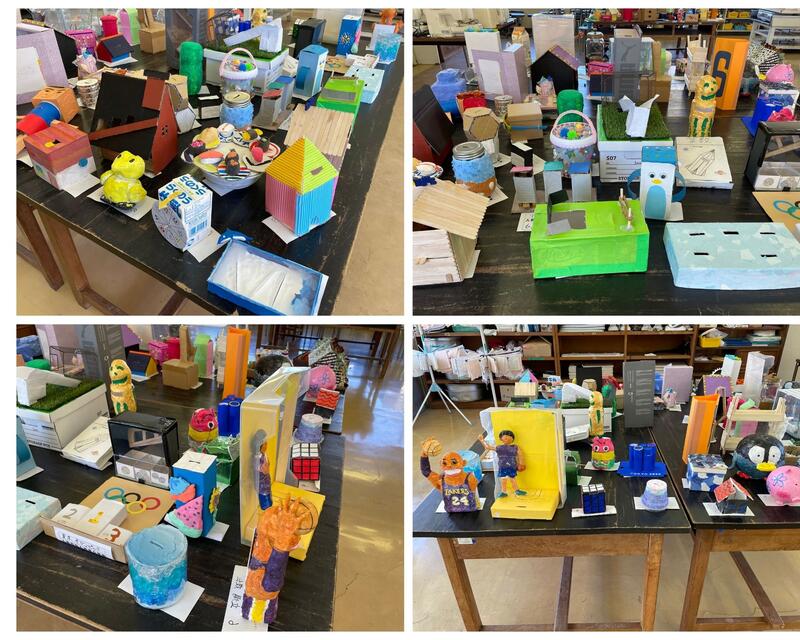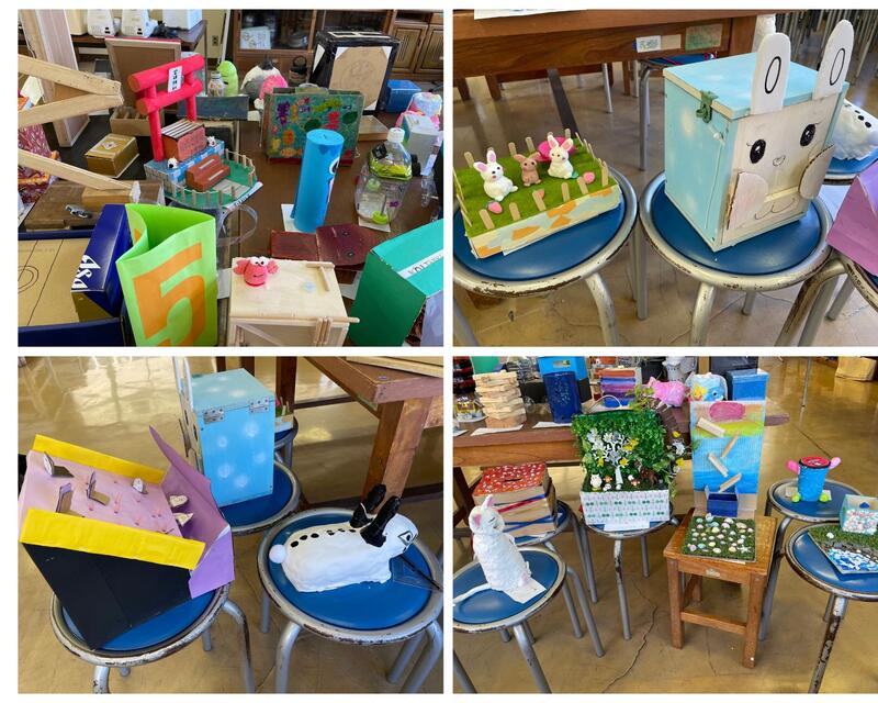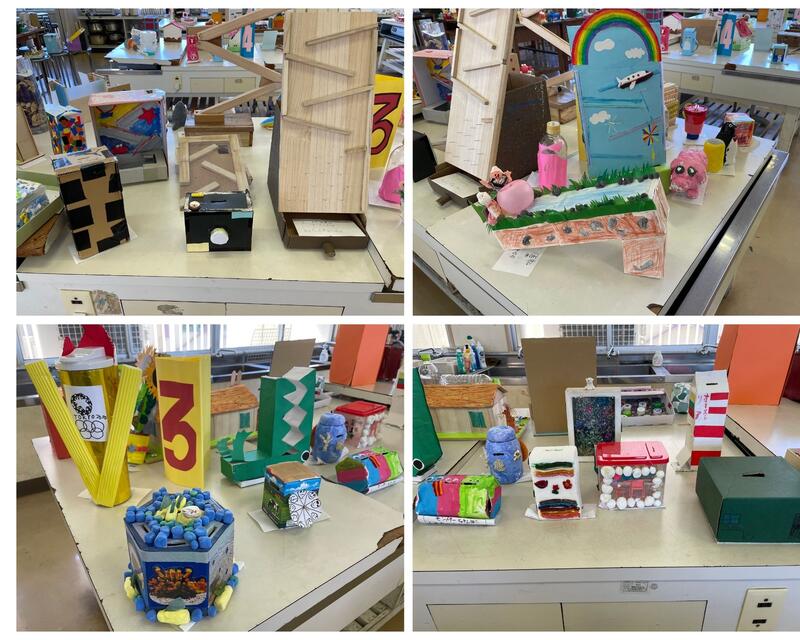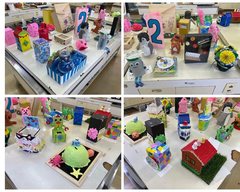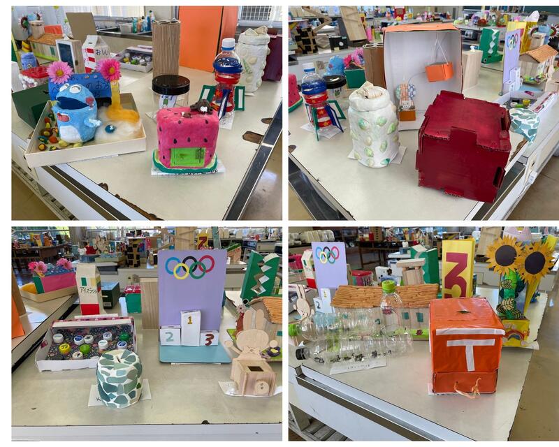 今、夏休みに子どもたちが制作した作品が家庭科室に展示されています。