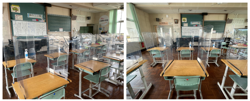 新型コロナウイルス感染症の感染拡大防止対策として、児童の机に設置する「飛沫防止パーテーション」が、音楽室の机に導入されました。