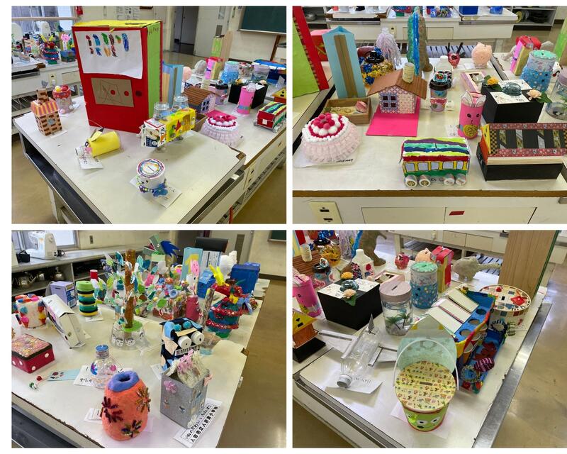 今、夏休みに子どもたちが制作した作品が家庭科室に展示されています。