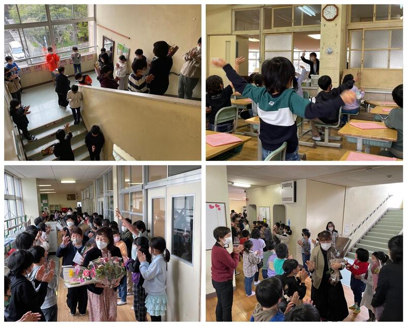 式の後は、各学年の廊下を回ってこられる転任・退職の先生方を、花道を作ったり手を振ったりしてお見送りしました。