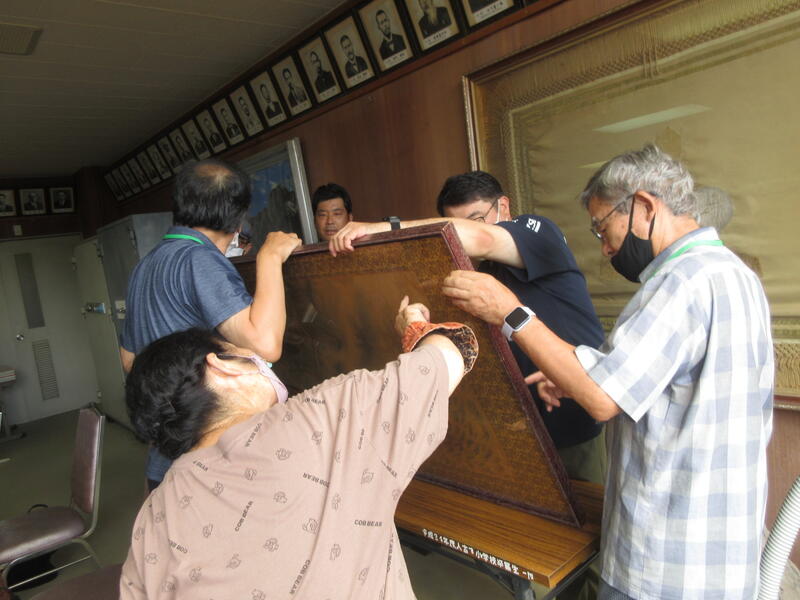 8月22日(火)に、人吉史談会(代表:大平 哲也さん)のメンバー8名が来校され、校長室や図書館、郷土資料室に掲示されている絵や書物、昔の道具等を見て回られました。いつの時代のものか、誰の作品か、どのような内容なのか等、メンバー同士で楽しく会話をされながら、掲示物の詳細な部分まで観察されていました。