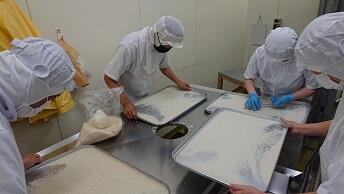ごはんの給食の前日には、お米に虫などが混ざっていないか点検しています。
