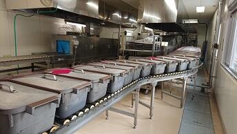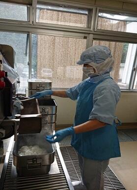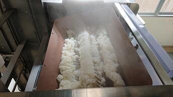 1日に220㎏のお米を炊いています。蒸らし時間もしっかりとって、配缶していきます。