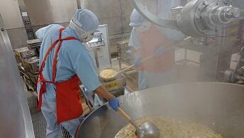汁物を作った大きい釜から、湯気が立ち上っています。