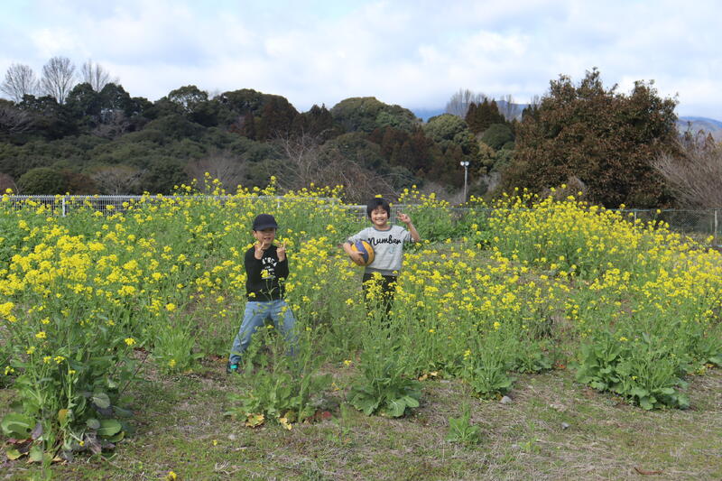 運動場にある菜の花 子供たちも誘われて遊びに来ていました。