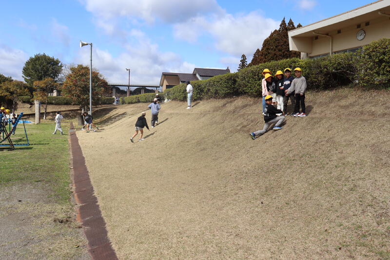低学年棟前の斜面は大人気
