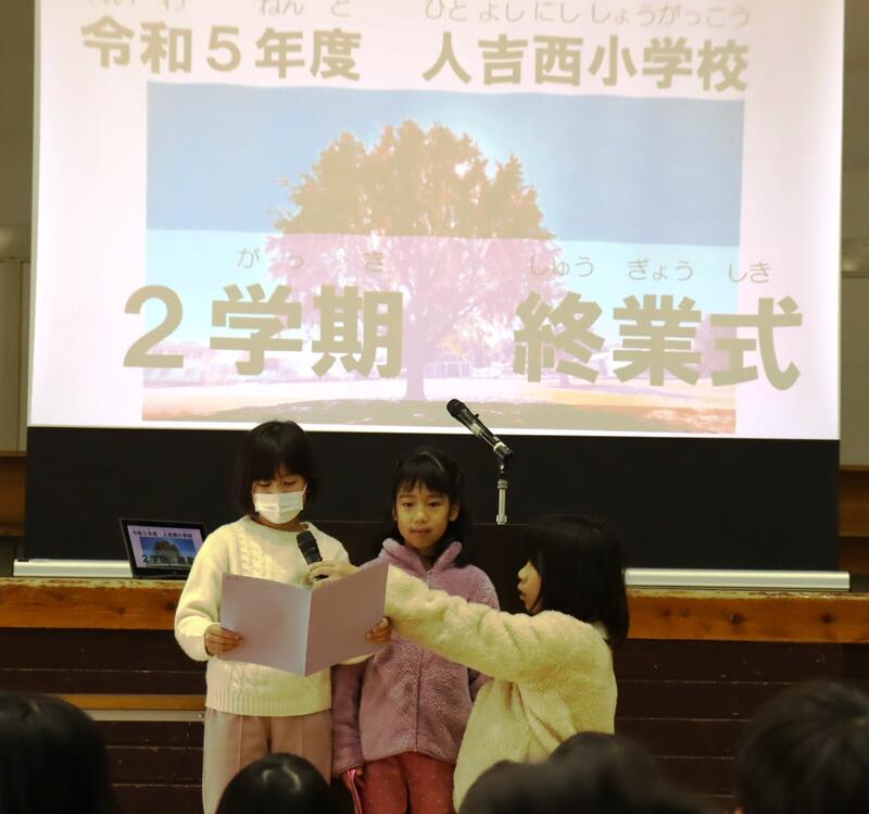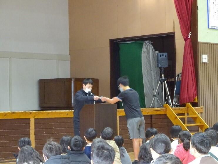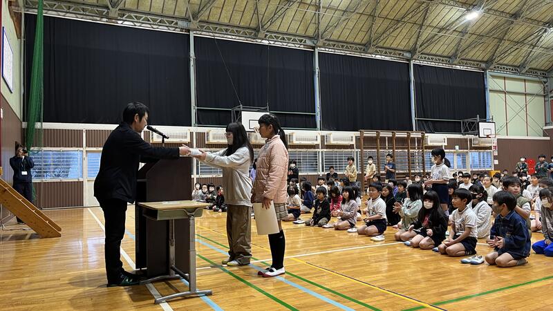 今年度最後の全校集会は、「熊本子どもの美術展」と「人吉・球磨小中学校工作展」の表彰でした。年度の最後まで、自分の力を発揮していた子どもたちでした。
