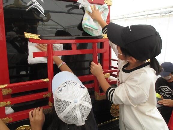 10月6日(木)、地域の伝統行事「おくんち祭り」の準備を手伝うため、青井神社に行ってきました。神社の中では祭りに向けて色々な準備が行われていました。子どもたちは、おみこしの掃除や竹を飾る手伝い、神社内の石拾いなどを行い、祭りに込める人々の思いを体験することができました。