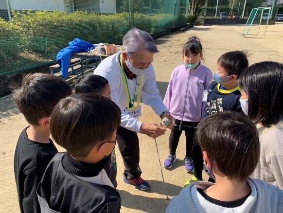 いちょうの下では、5年生と民生委員児童委員さんとの交流グランドゴルフ
