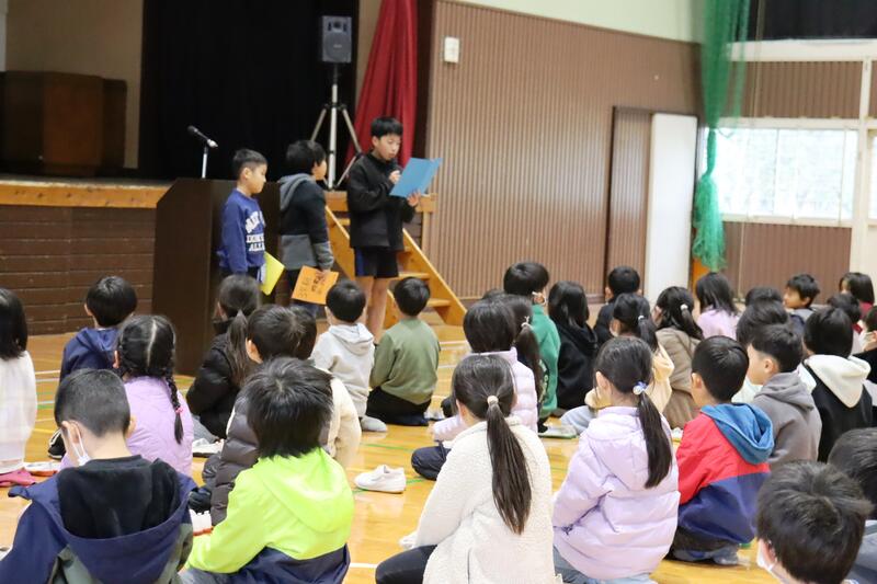 全学年で集まり、自分たちが学習してきた人権学習の内容を踏まえながら、各学年の人権スローガンの振り返りを発表しました。
