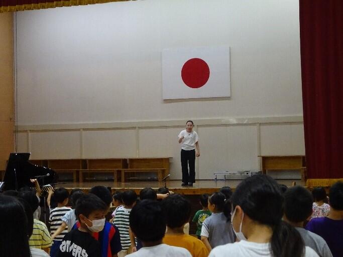 2・4・6年生による発表校長先生のお話8月28日(月)は2学期始業式でした。長い夏休みも終わり、学校には子どもたちの元気な声が戻ってきました。始業式では2年・4年・6年の代表児童が「夏休みの思い出と2学期の目標」を発表しました。校長先生のお話では、よりたくましい心と体をもった人になってほしいという思いから「体力や自分の体を大切にする力をつけてほしい」とお話がありました。