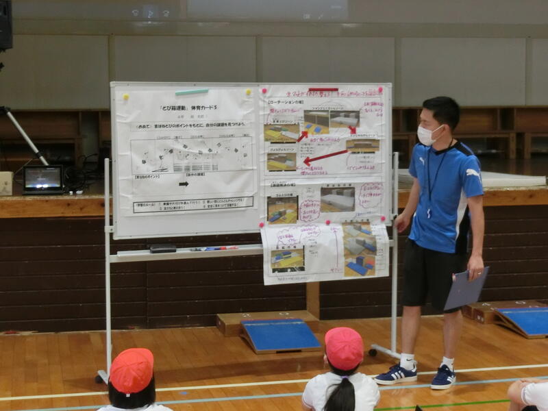 1月27日(木)の5校時に、人吉球磨の小学校体育研究会の研究授業を4年1組で行いました。「首はねとびのポイントを知り、自分の課題を見つけること」がこの時間の目標です。タブレットを使って自分の動きとモデルの動きを比べたり、多くの場を作って跳び箱に必要な動き作りをしたりと、子どもたちは生き生きと楽しそうに跳び箱運動を行っていました。