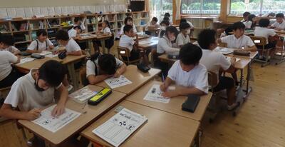 3年生が石工の唄のレコーディングを行いました。練習の成果を生かして歌声に思いを乗せることができました。レベルアップした3年生の姿でした。