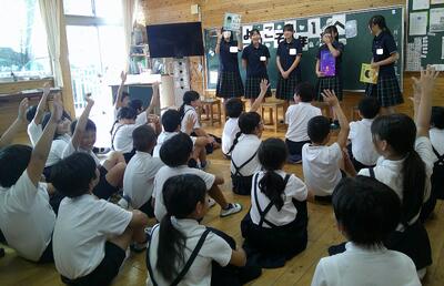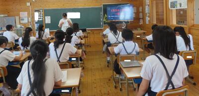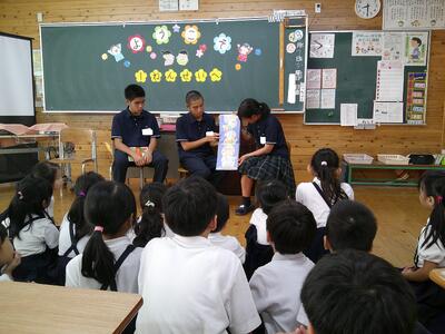清和文楽の里協会から8名が来校され、清和文楽の公演が行われました。初めは「雪おんな 船頭小屋の段」の人形芝居が公演されました。雪おんなが登場し、太夫の語りと三味線の音色が大きく速くなり、雪おんなの表情が変わったところで大きな歓声が上がりました。その後、人形を操作する体験が行われ、笑顔いっぱい貴重な体験をさせてもらいました。清和文楽の里の皆様、ものすごい暑さの中で公演いただきありがとうございました。