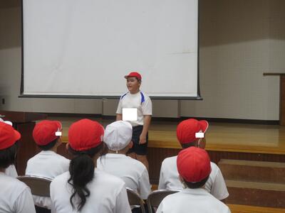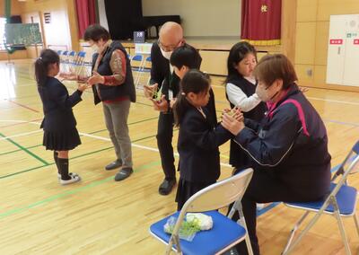 本渡東地区民生委員・児童委員の方々をお迎えし、子ども民生委員委嘱状交付式が行われました。1年生が新しく子ども民政委員になり、地域のおじいちゃん・おばあちゃんにあいさつをして元気になってもらいたいという思いを発表しました。その後、4年生が認知症サポーター講座を受講し、オレンジリングをいただきました。