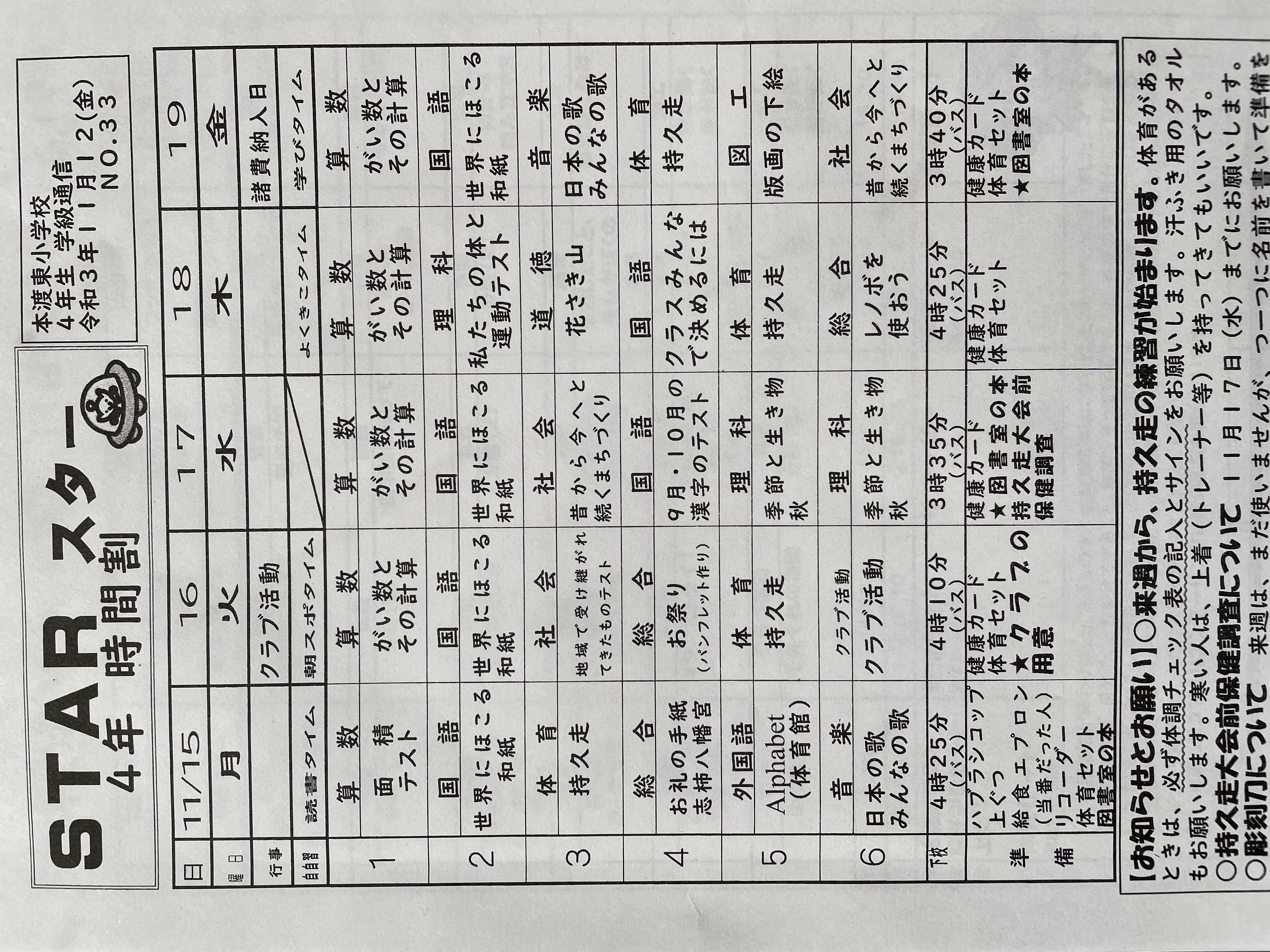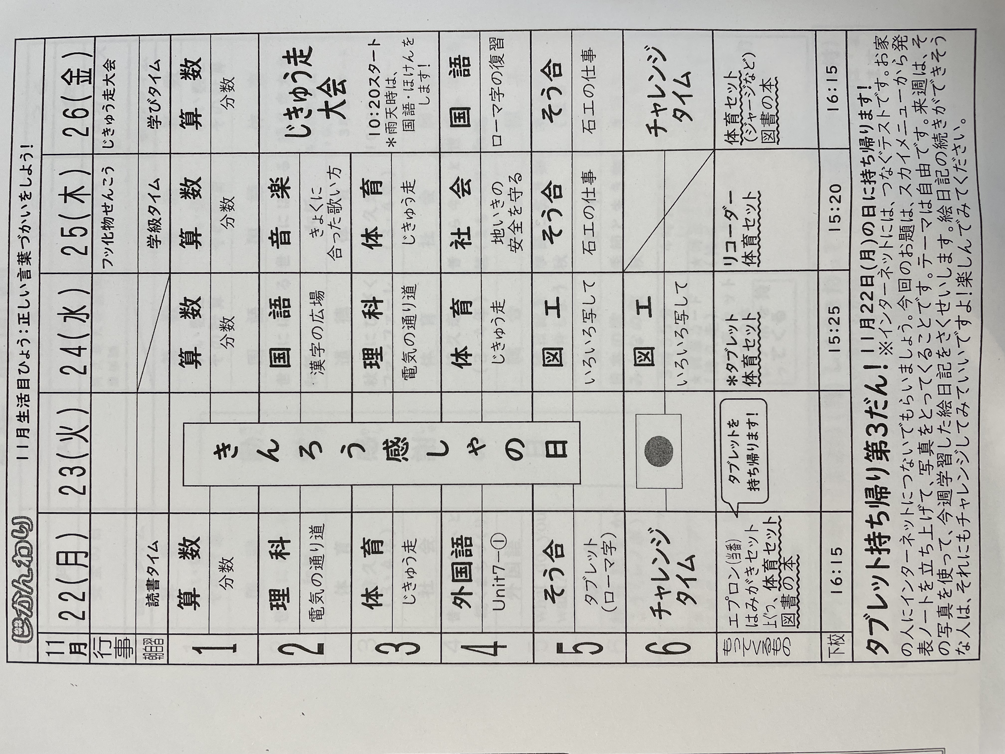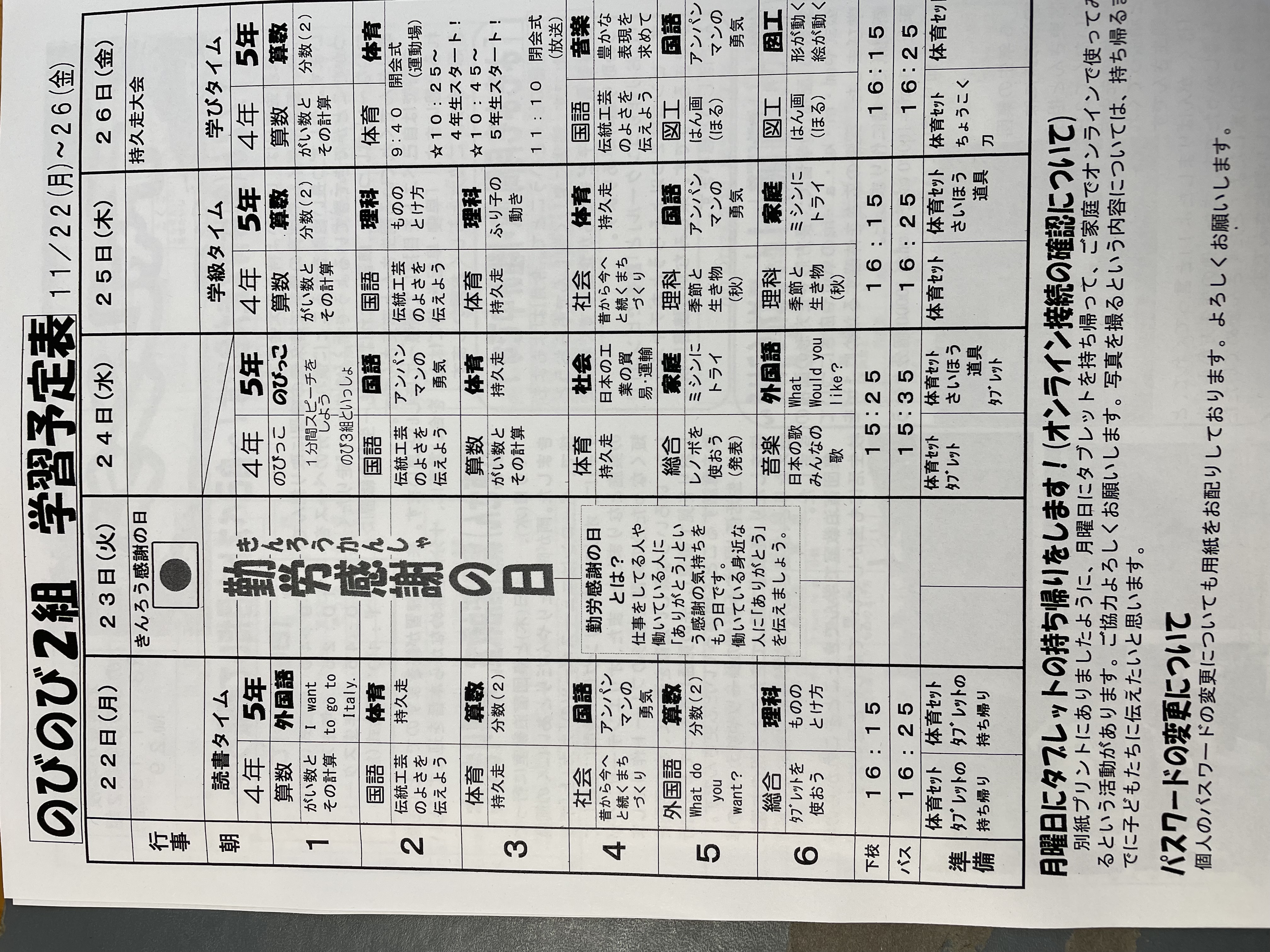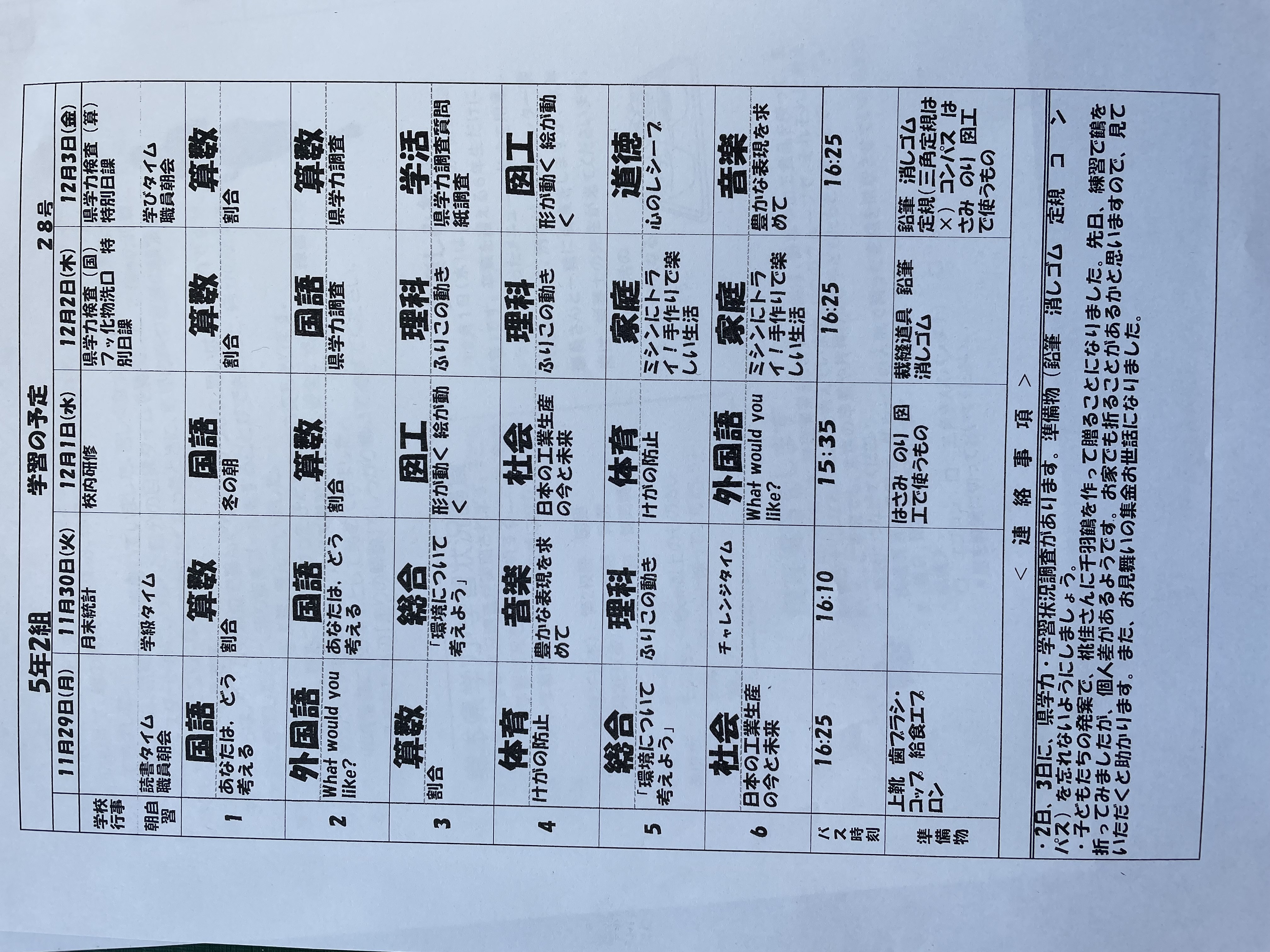 11月22日~11月26日までの時間割 投稿日時 : 2021/11/22 学校サイト管理者 1年1組.JPG 1年2組.JPG 2年1組.JPG 3年1組.JPG 4年1組.JPG 5年1組.JPG 5年2組.JPG 6年1組.JPG の1組1年.JPG の1組3年.JPG の1組5年6年.JPG の2組4年5年.JPG の3組1年.JPG の3組2年.JPG の3組3年.JPG の3組5年.JPG