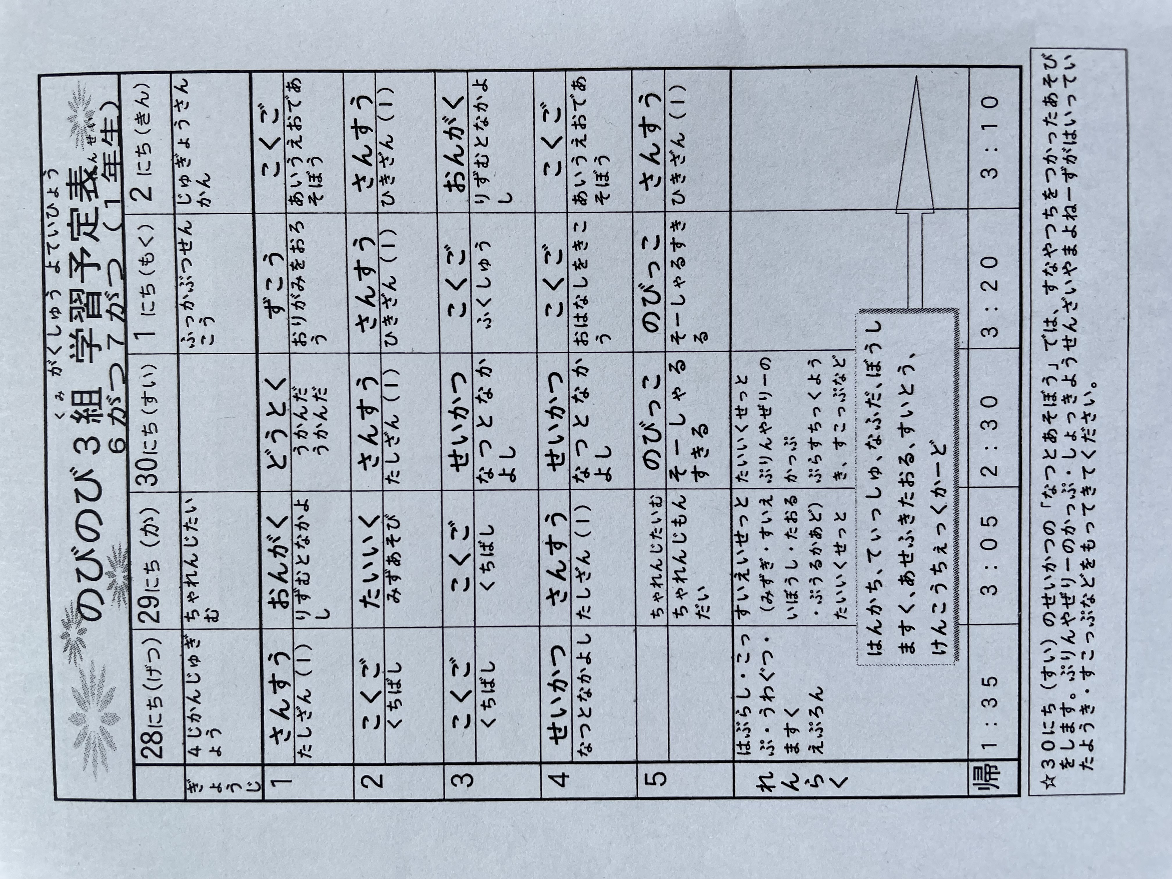 5月6日~5月7日までの時間割 投稿日時 : 2021/05/06 学校サイト管理者 1年1組.JPG 1年2組.JPG 2年1組.JPG 3年1組.JPG 4年1組.JPG 5年1組.JPG 5年2組.JPG 6年1組.JPG の1組1年.JPG の1組3年.JPG の1組5・6年.JPG の2組4・5年.JPG の3組1年.JPG