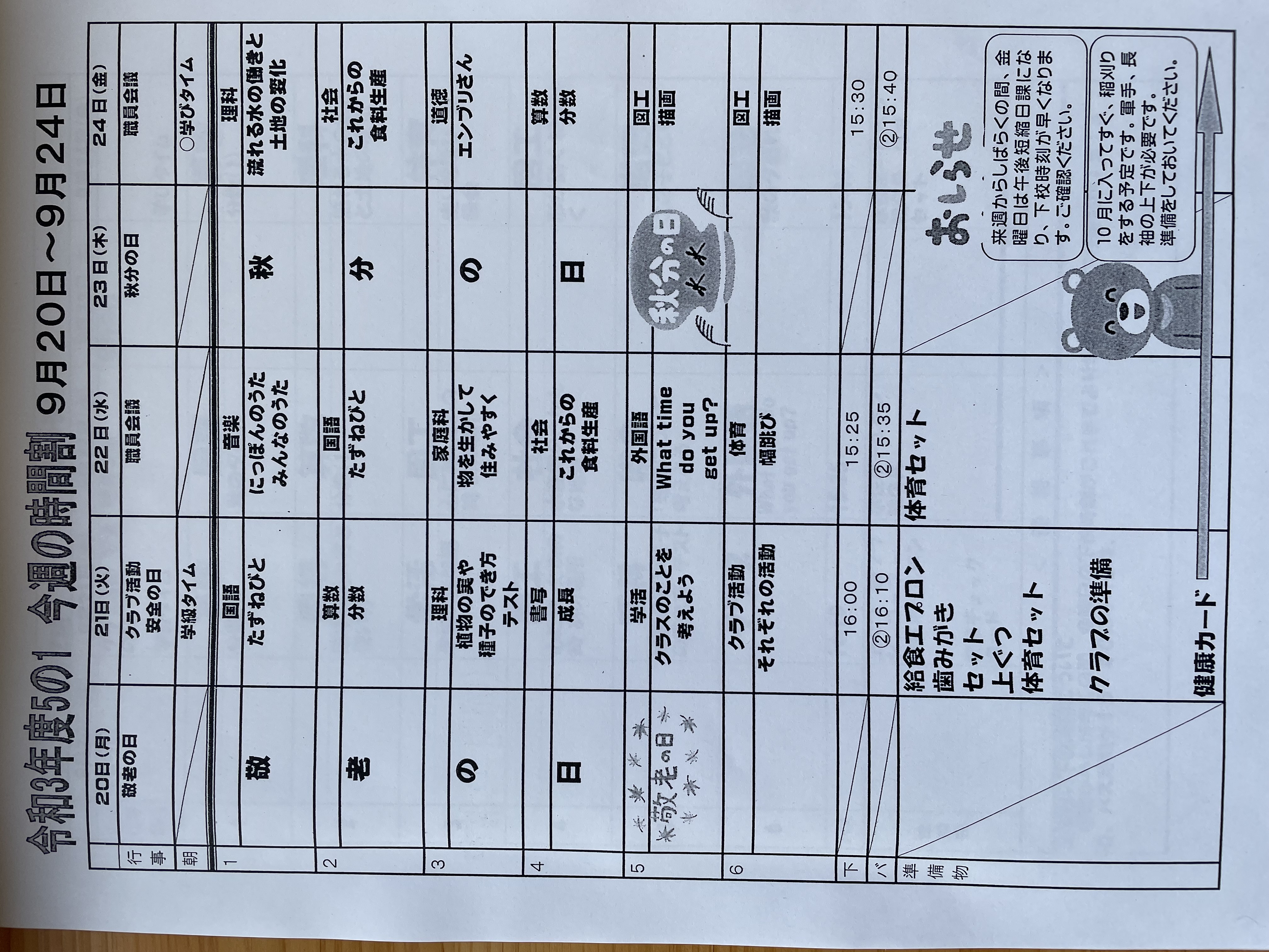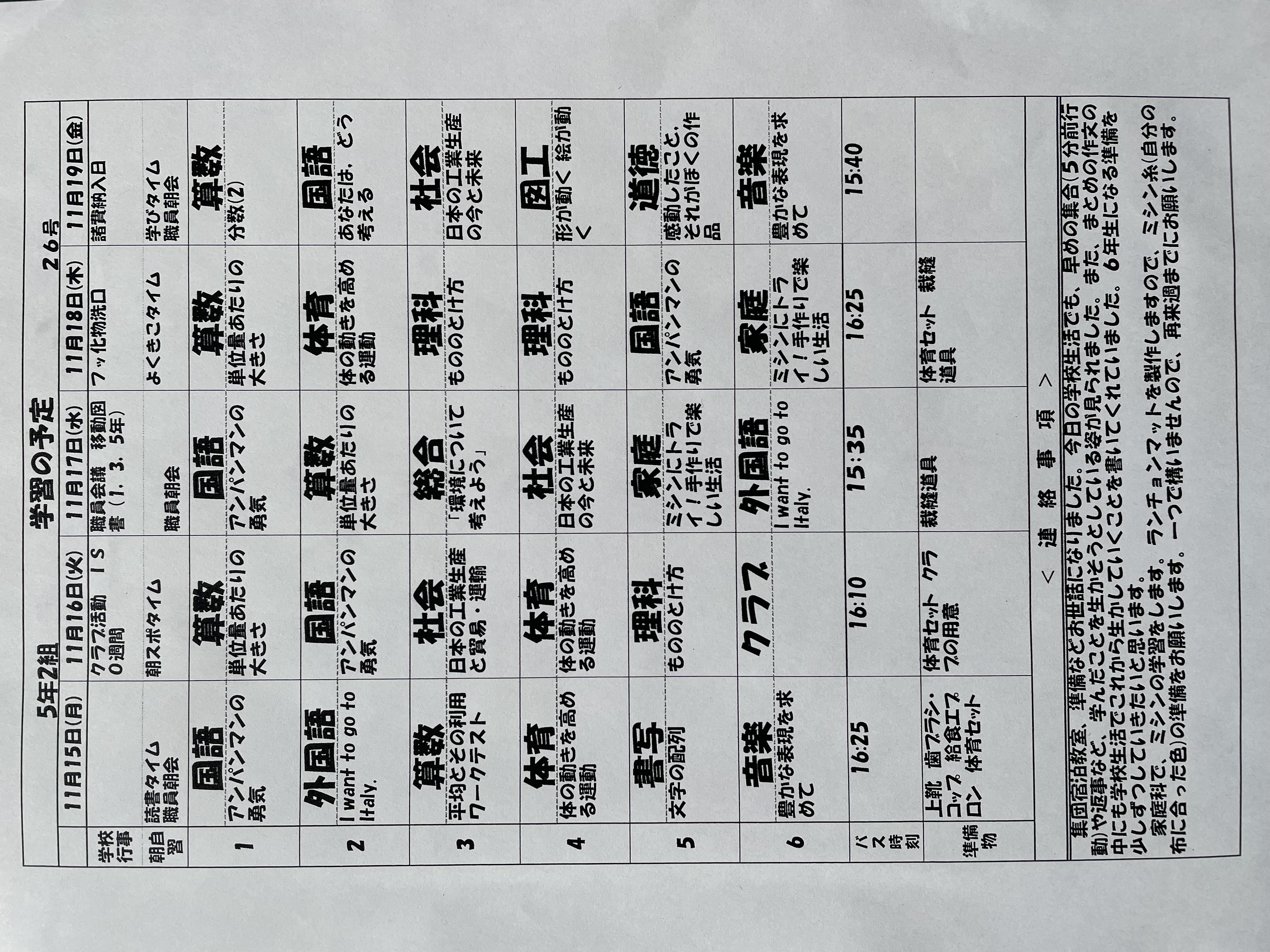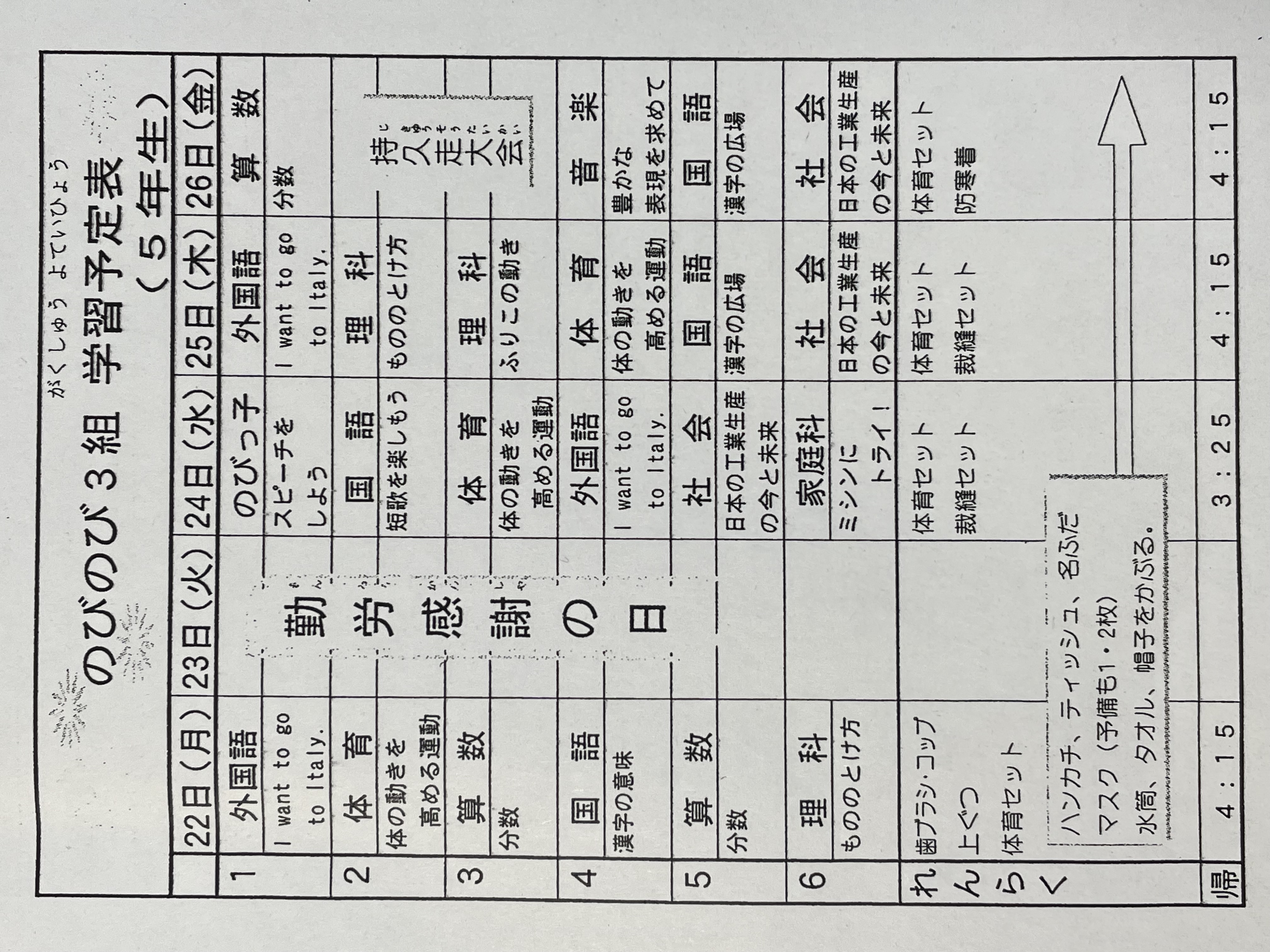 11月22日~11月26日までの時間割 投稿日時 : 2021/11/22 学校サイト管理者 1年1組.JPG 1年2組.JPG 2年1組.JPG 3年1組.JPG 4年1組.JPG 5年1組.JPG 5年2組.JPG 6年1組.JPG の1組1年.JPG の1組3年.JPG の1組5年6年.JPG の2組4年5年.JPG の3組1年.JPG の3組2年.JPG の3組3年.JPG の3組5年.JPG