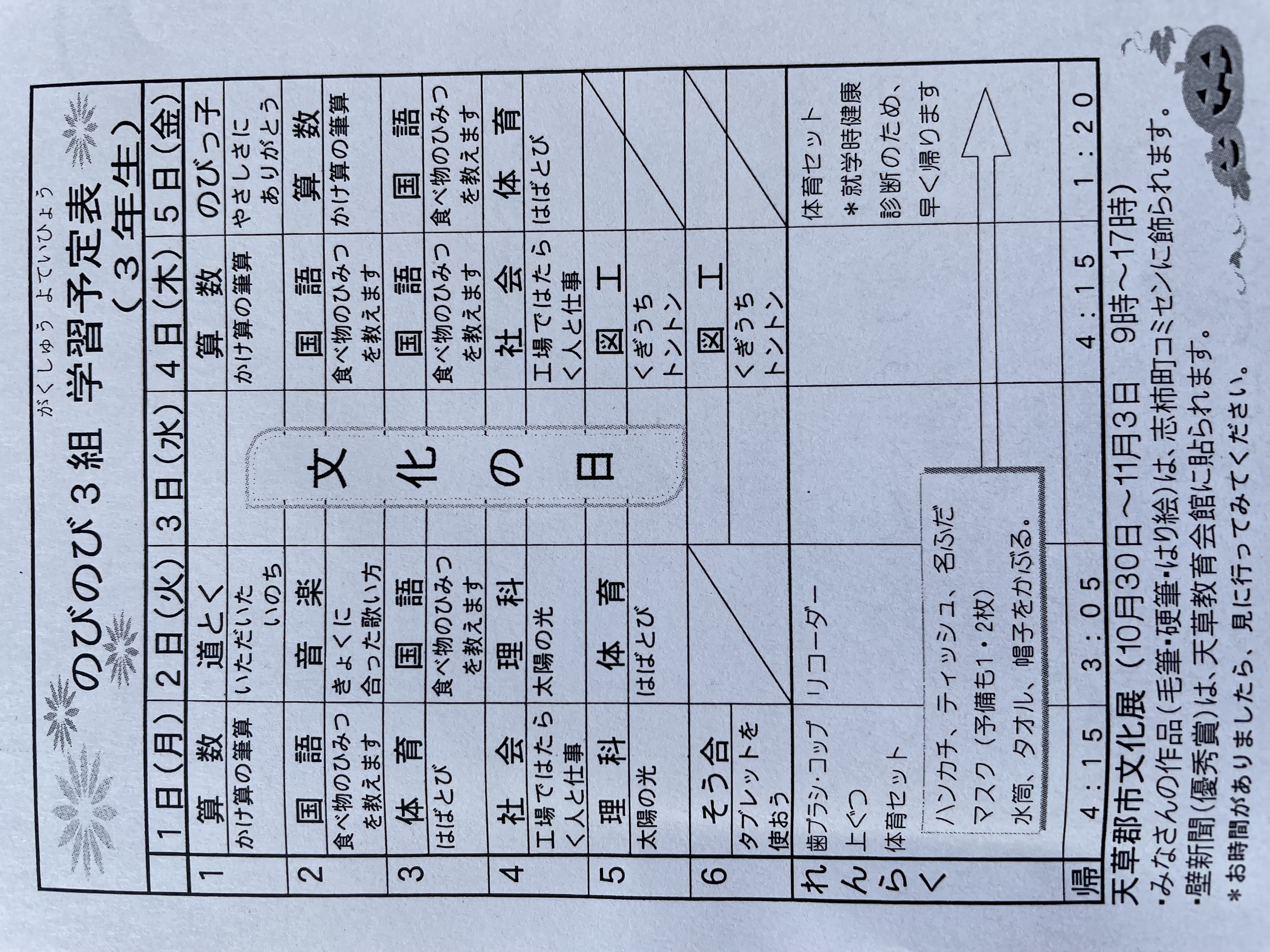 11月1日~11月5日までの時間割 投稿日時 : 2021/11/01 学校サイト管理者 1年1組.JPG 1年2組.JPG 2年1組.JPG 3年1組.JPG 4年1組.JPG 5年1組.JPG 5年2組.JPG の1組1年.JPG の1組3年.JPG の1組5・6年.JPG の2組4・5年.JPG の3組1年.JPG の3組2年.JPG の3組3年.JPG の3組5年.JPG