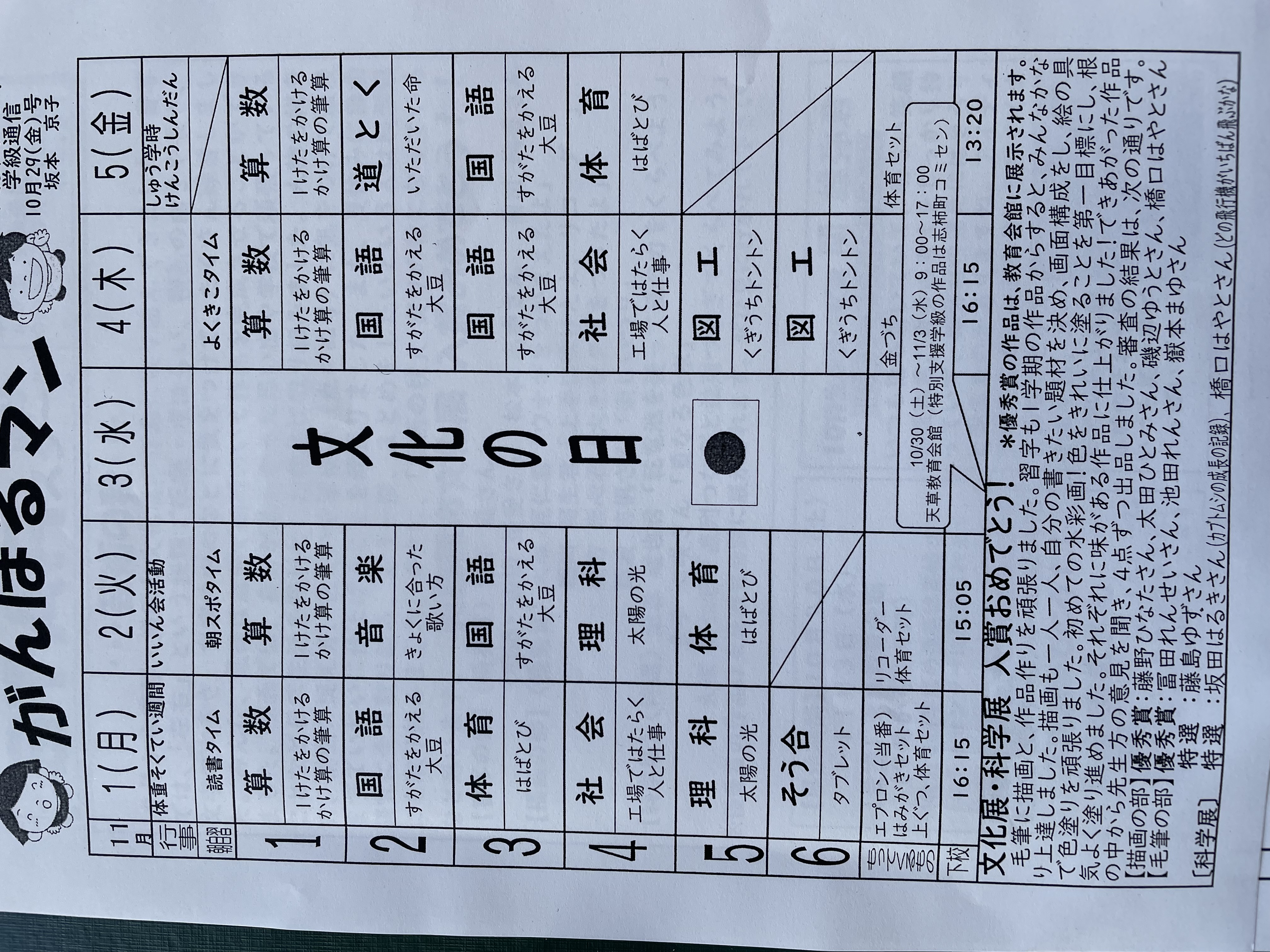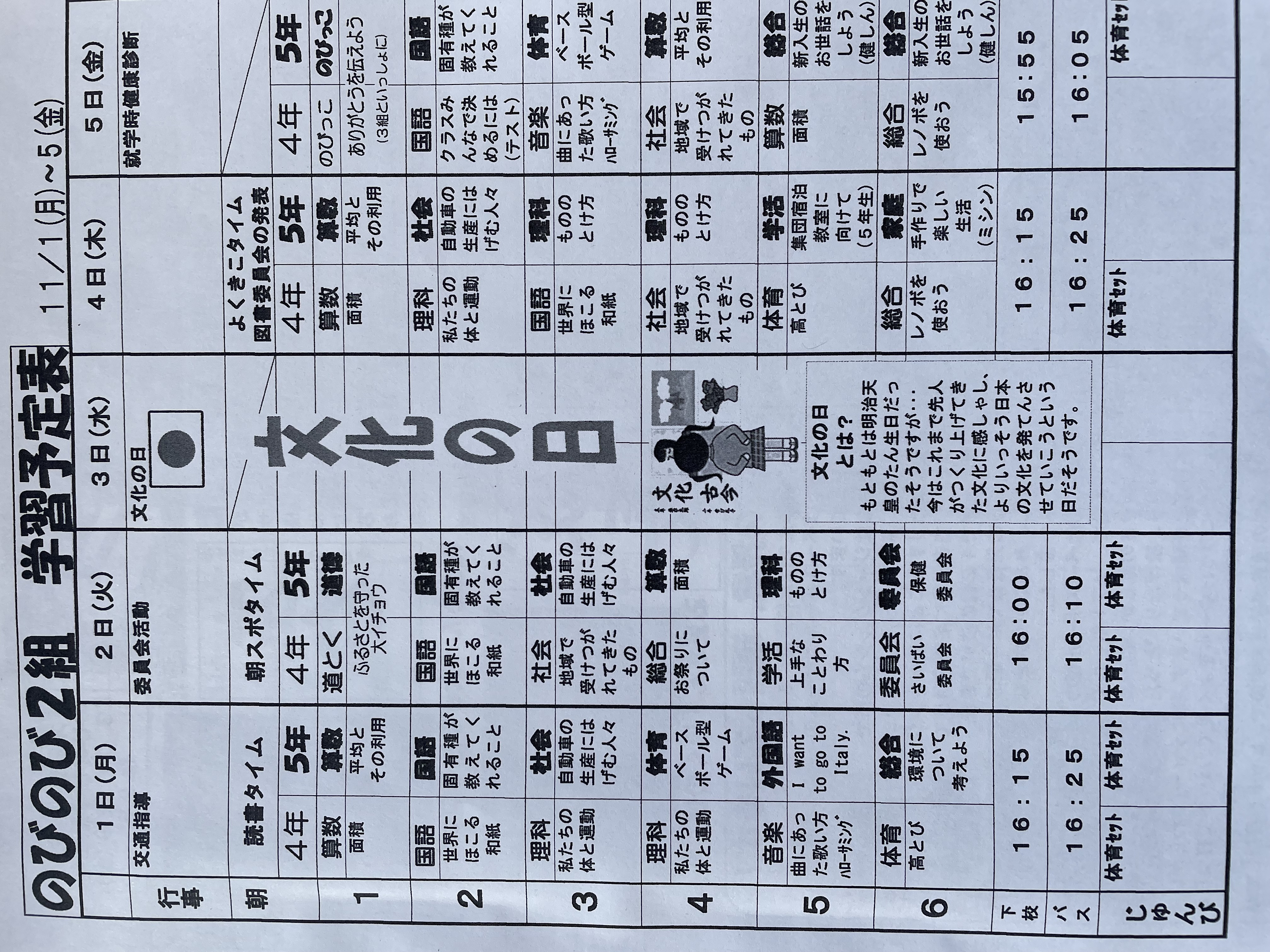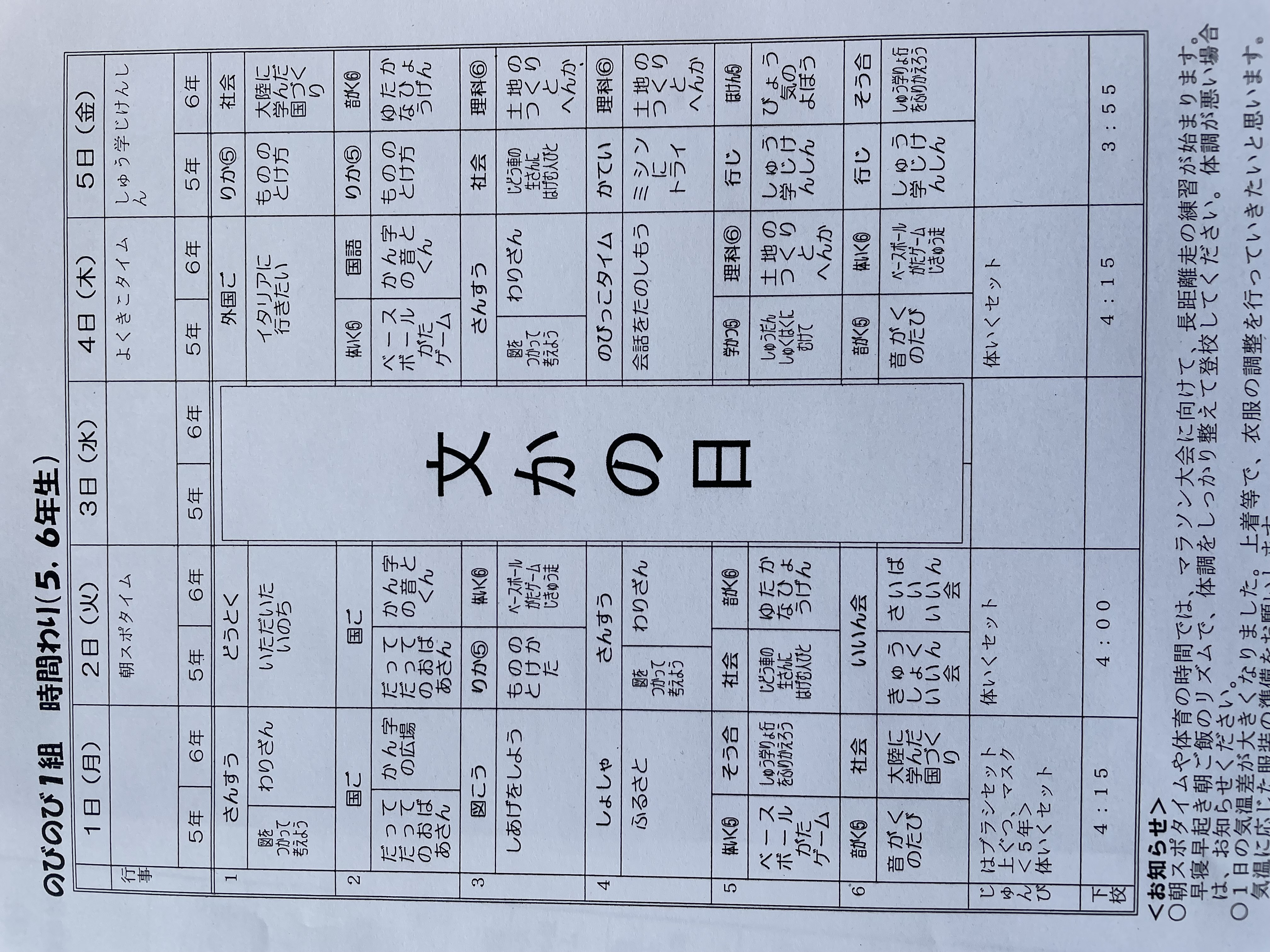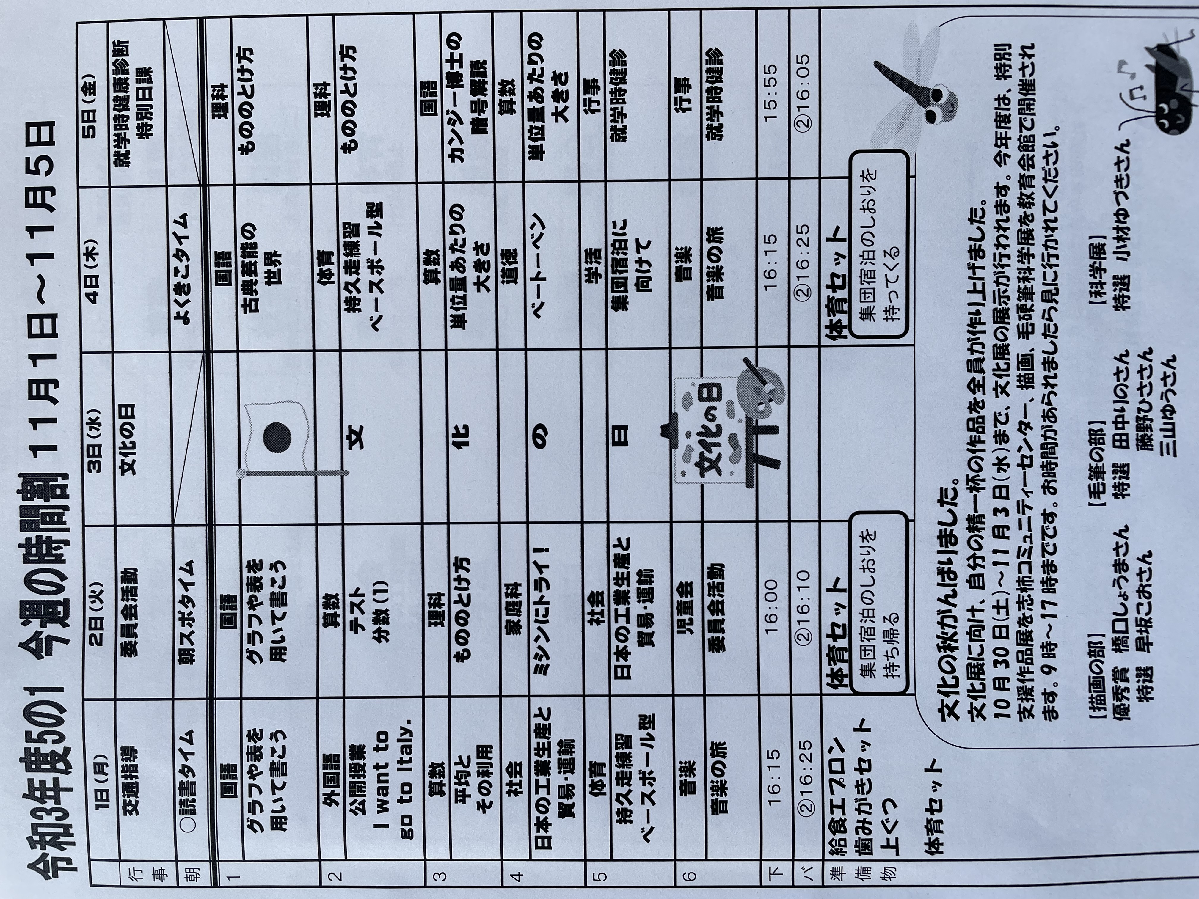 11月1日~11月5日までの時間割 投稿日時 : 2021/11/01 学校サイト管理者 1年1組.JPG 1年2組.JPG 2年1組.JPG 3年1組.JPG 4年1組.JPG 5年1組.JPG 5年2組.JPG の1組1年.JPG の1組3年.JPG の1組5・6年.JPG の2組4・5年.JPG の3組1年.JPG の3組2年.JPG の3組3年.JPG の3組5年.JPG
