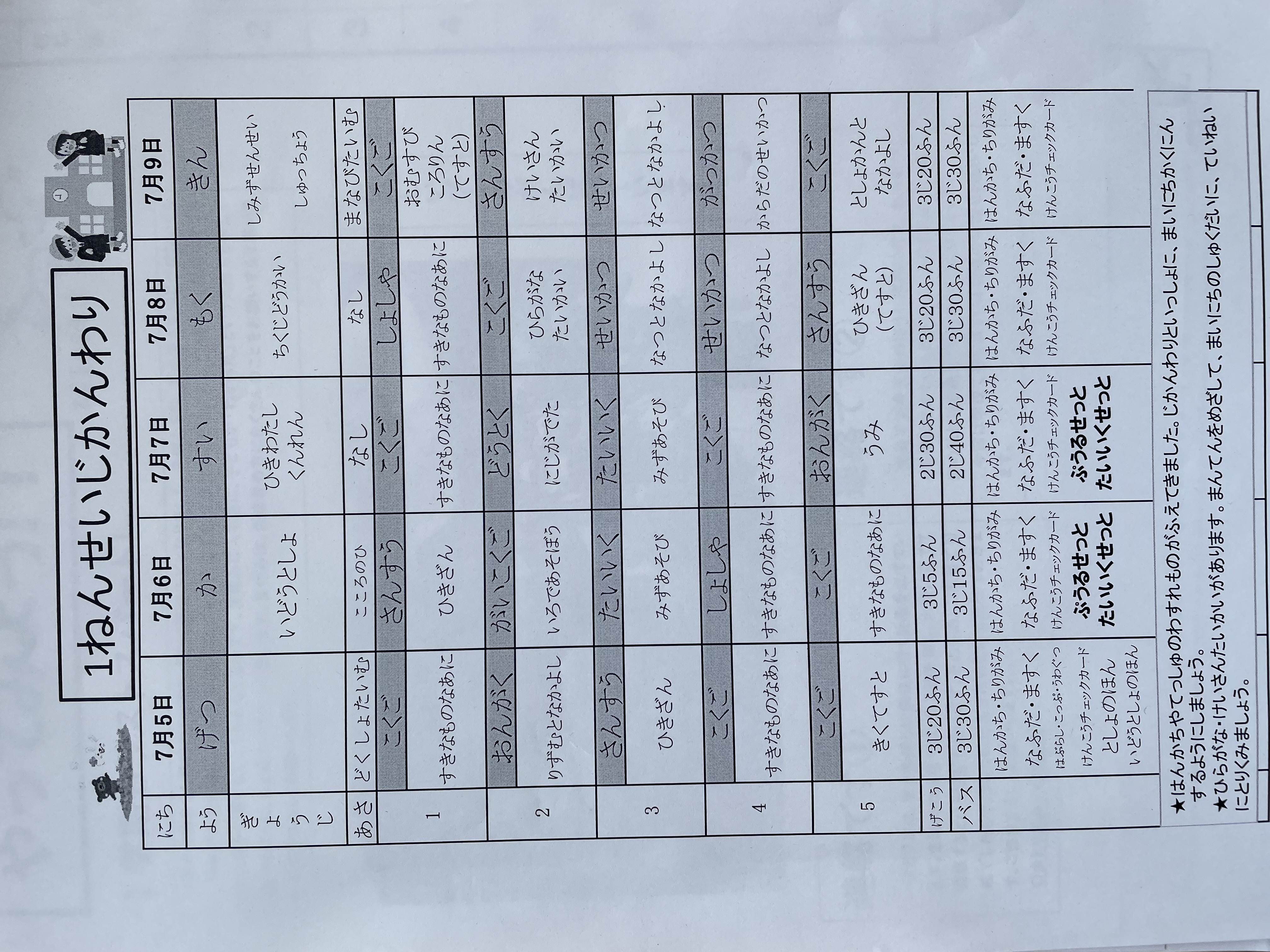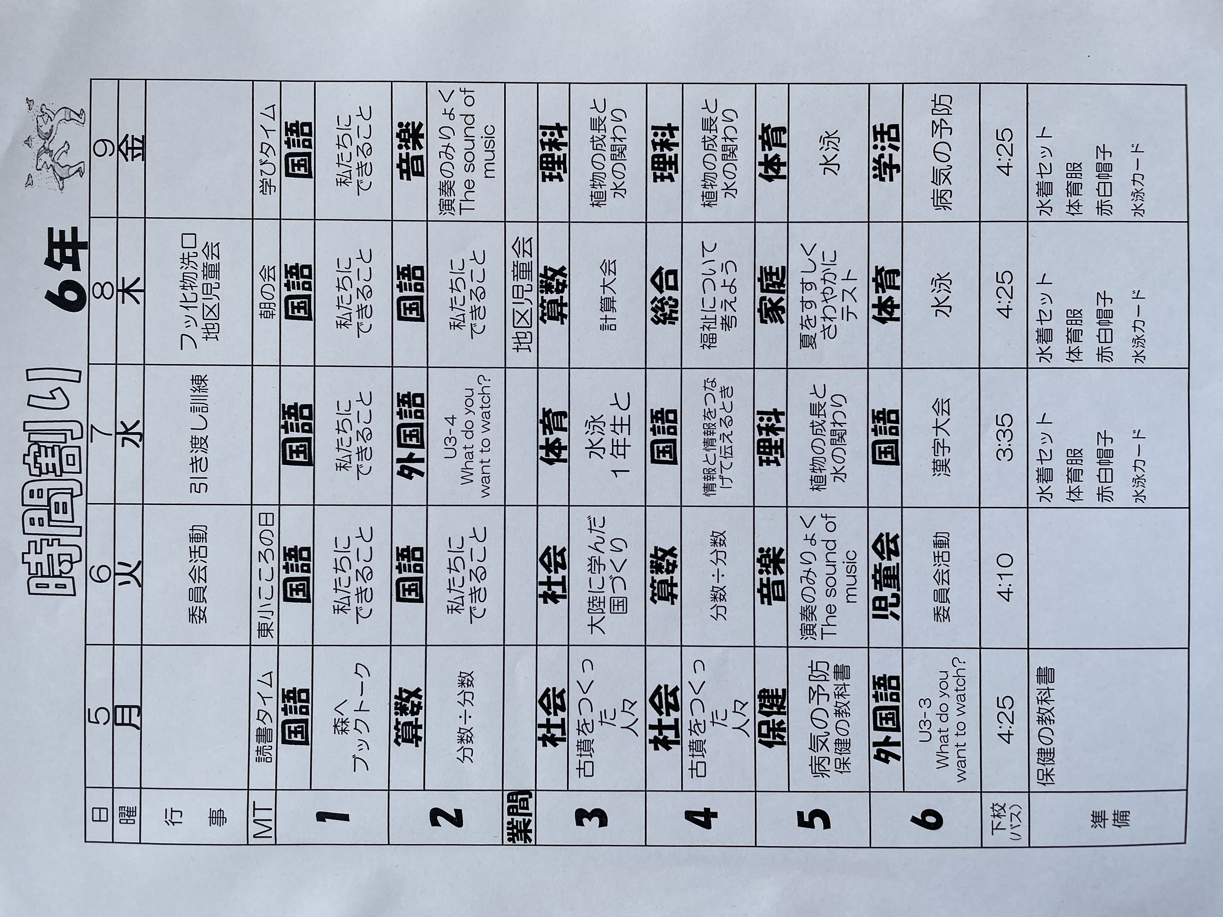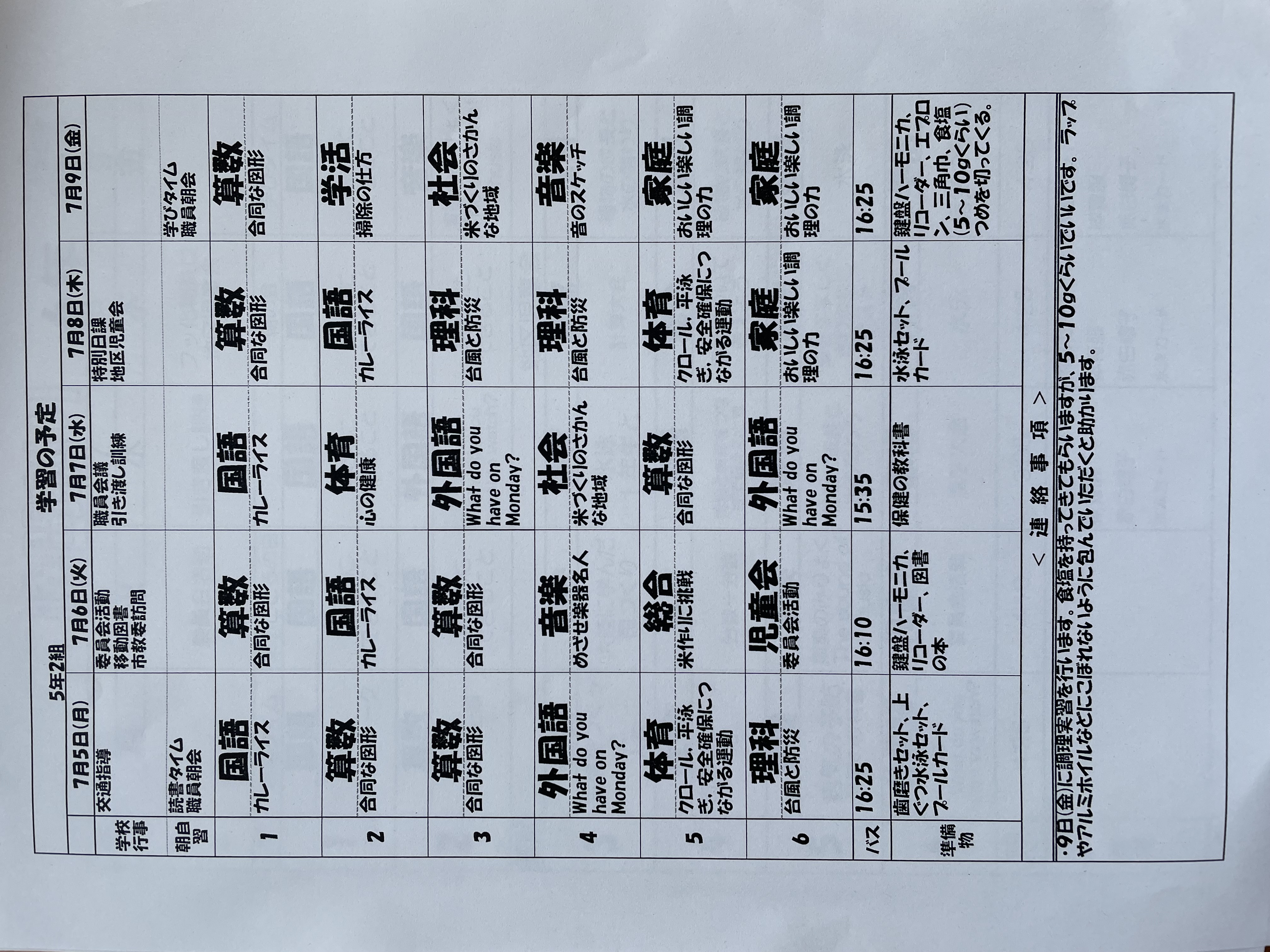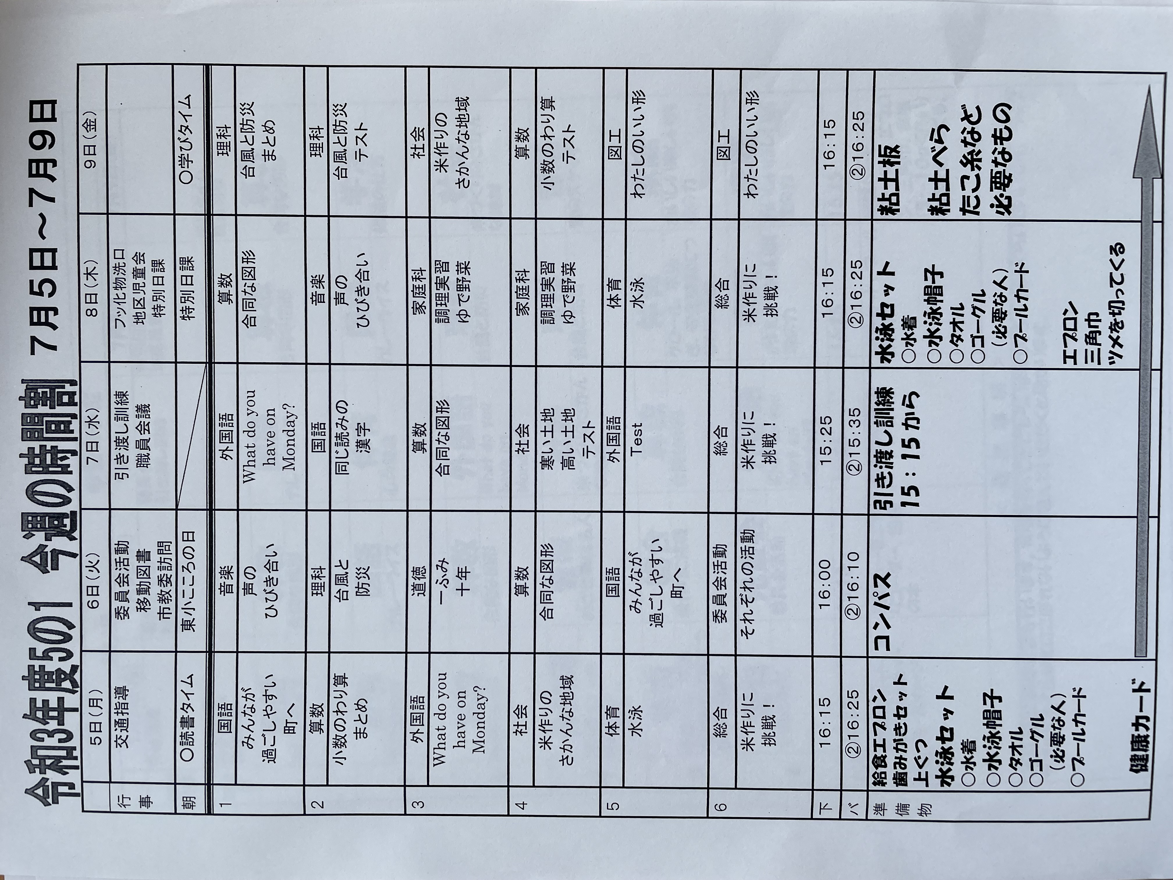 7月5日~7月9日までの時間割 投稿日時 : 2021/07/05 学校サイト管理者 1年1組.JPG 1年2組.JPG 2年1組.JPG 3年1組.JPG 4年1組.JPG 5年1組.JPG 5年2組.JPG 6年1組.JPG の1組1年.JPG の1組3年.JPG の1組5年・6年.JPG の2組4年・5年.JPG の3組1年.JPG の3組2年.JPG の3組3年.JPG の3組5年.JPG