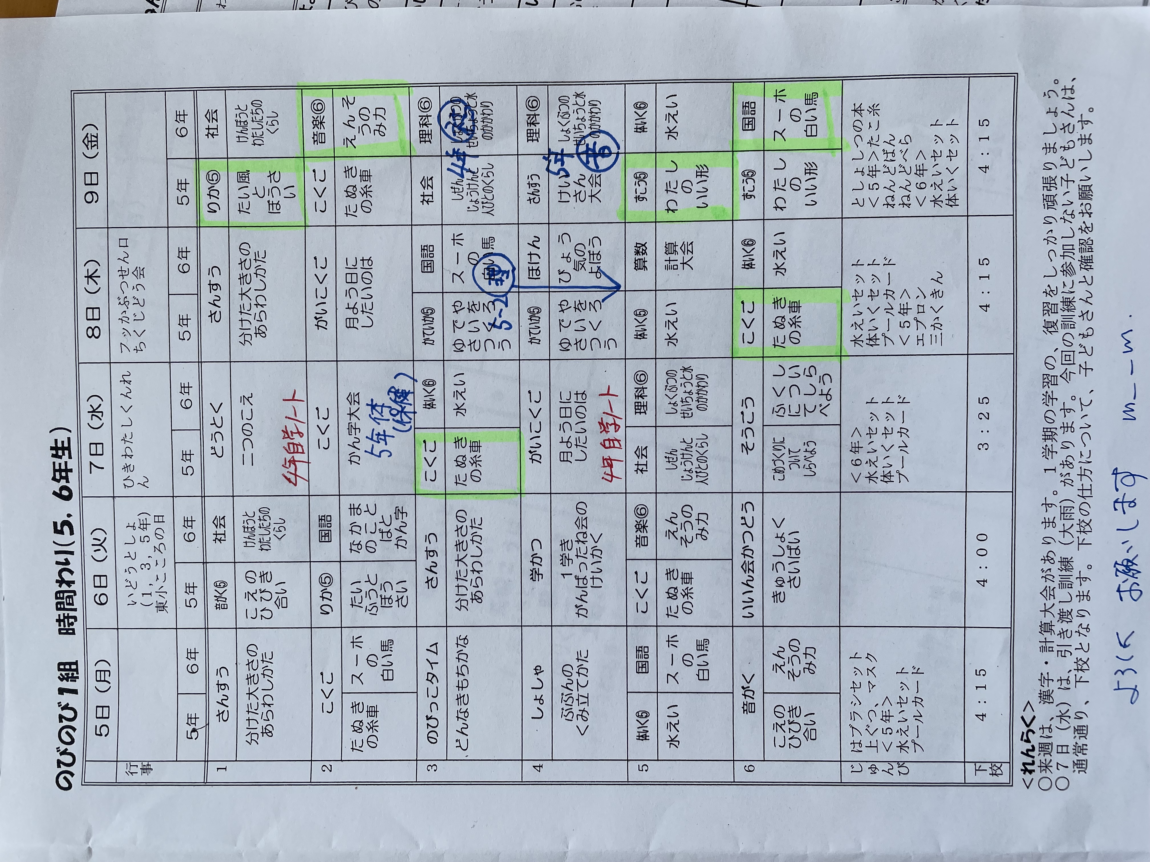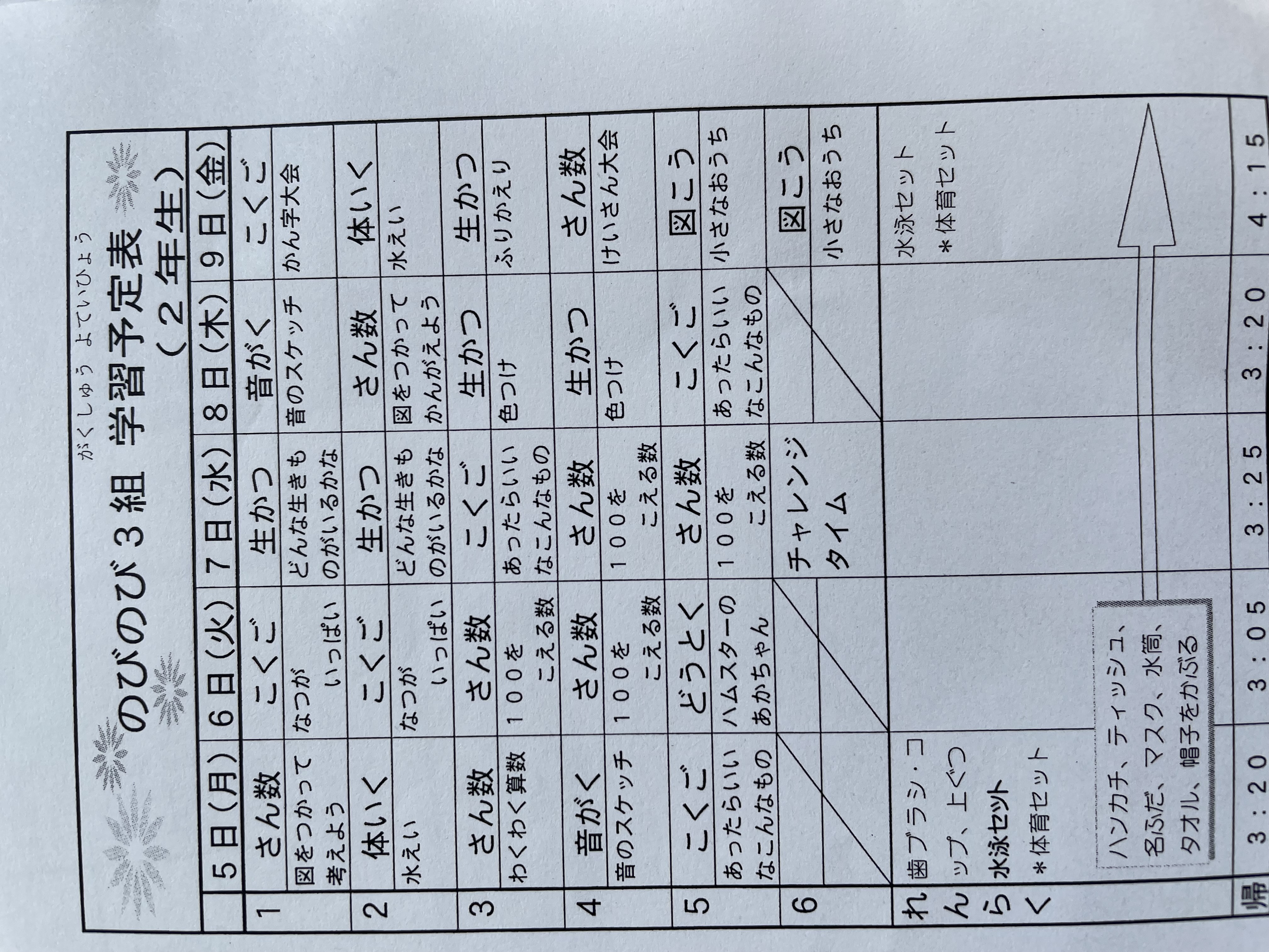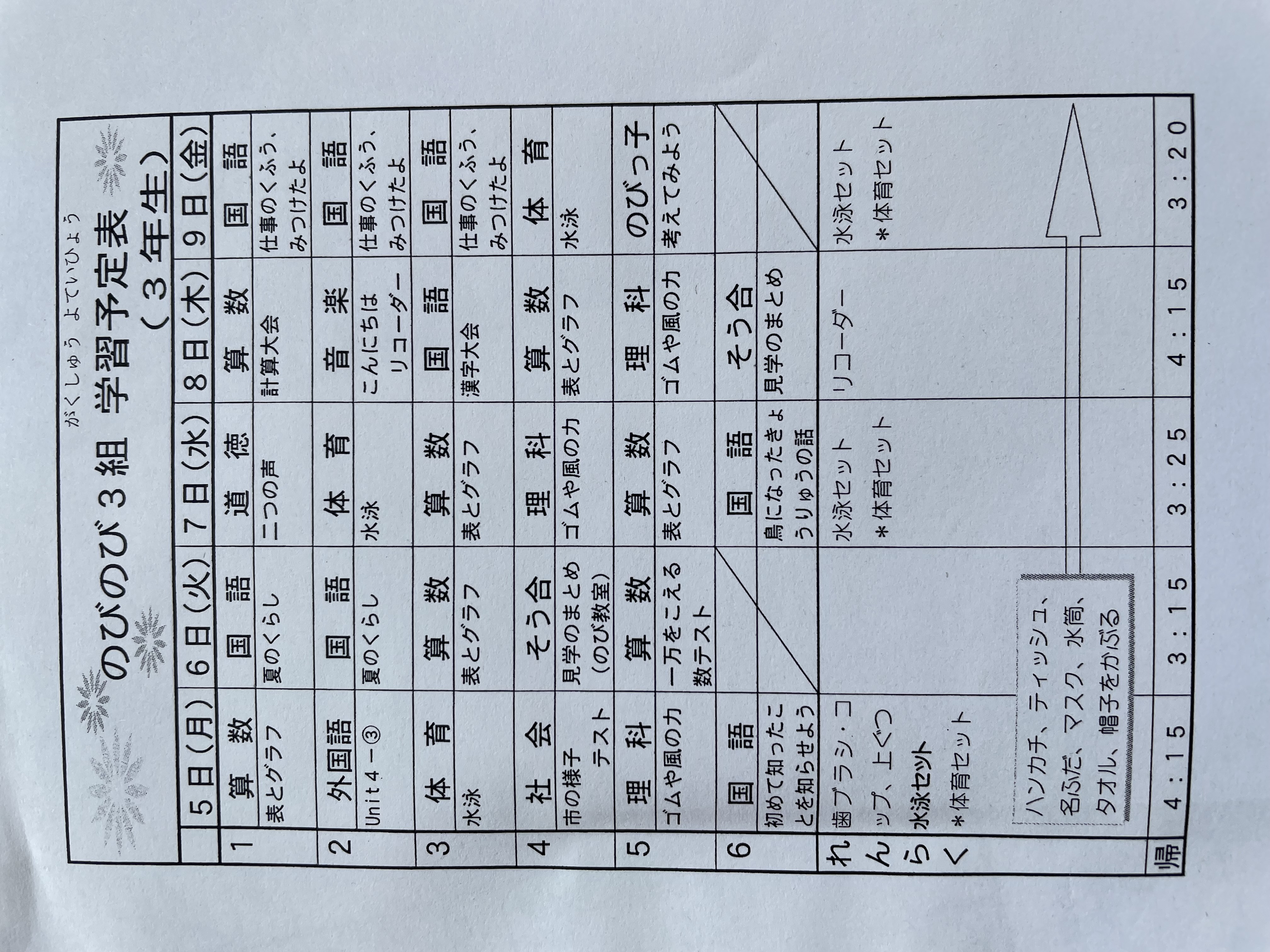 7月5日~7月9日までの時間割 投稿日時 : 2021/07/05 学校サイト管理者 1年1組.JPG 1年2組.JPG 2年1組.JPG 3年1組.JPG 4年1組.JPG 5年1組.JPG 5年2組.JPG 6年1組.JPG の1組1年.JPG の1組3年.JPG の1組5年・6年.JPG の2組4年・5年.JPG の3組1年.JPG の3組2年.JPG の3組3年.JPG の3組5年.JPG