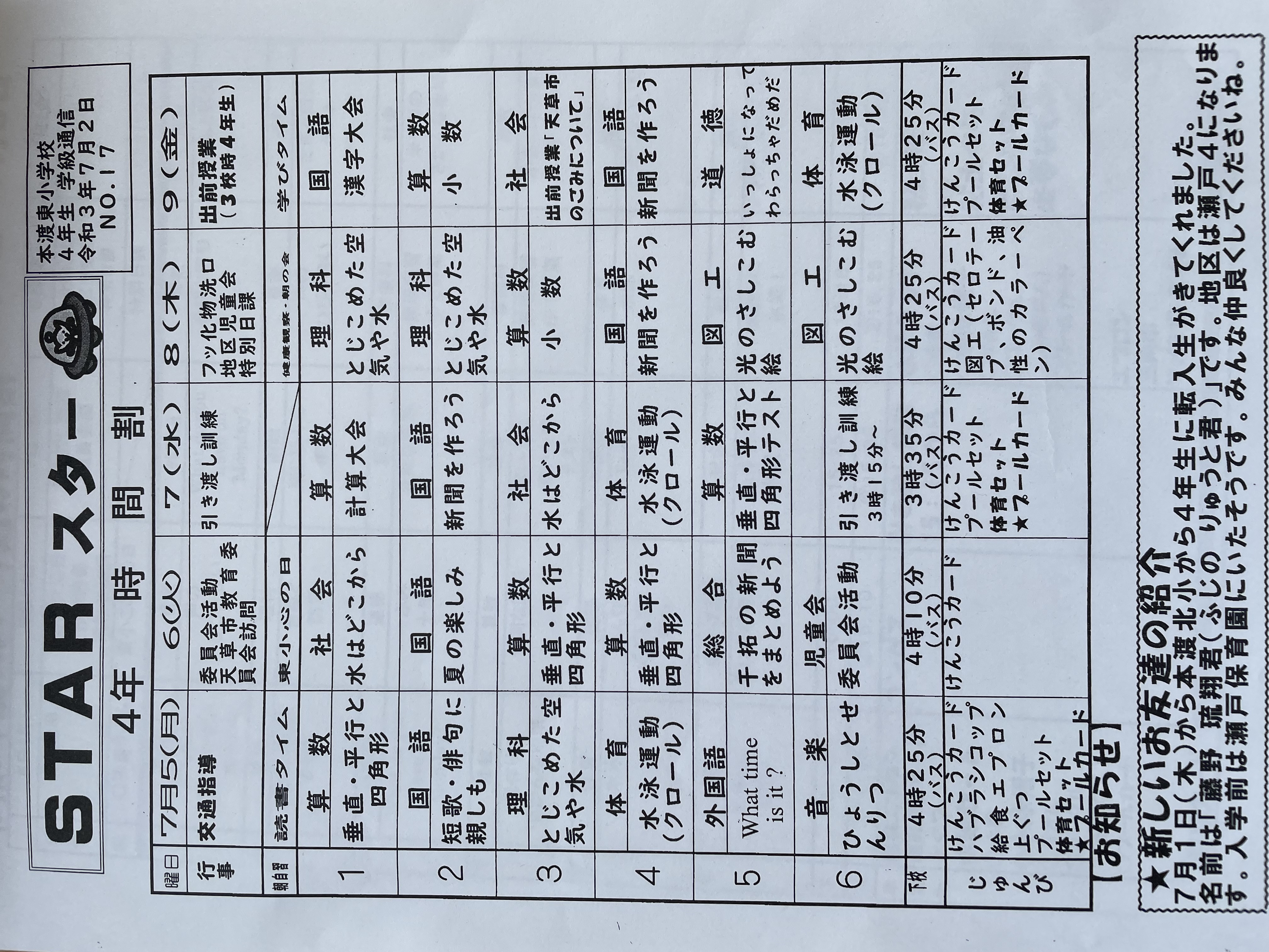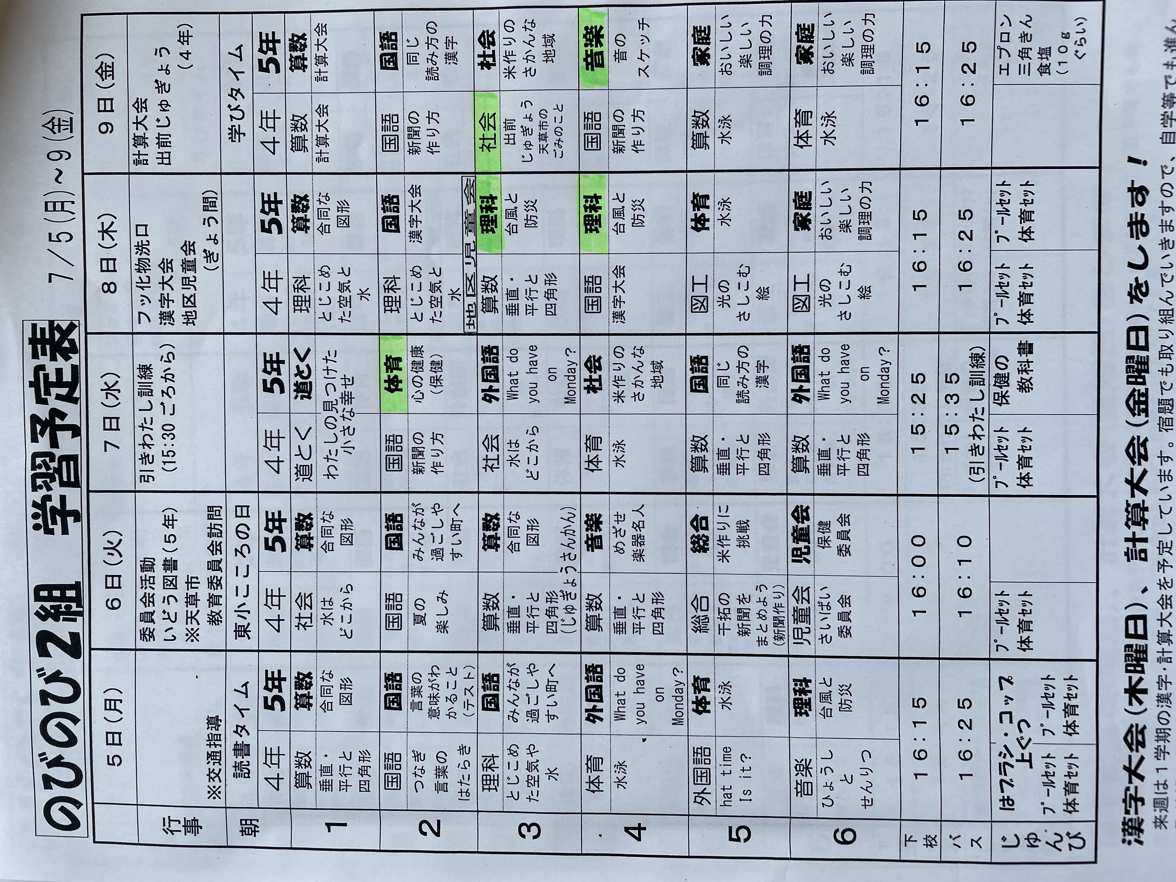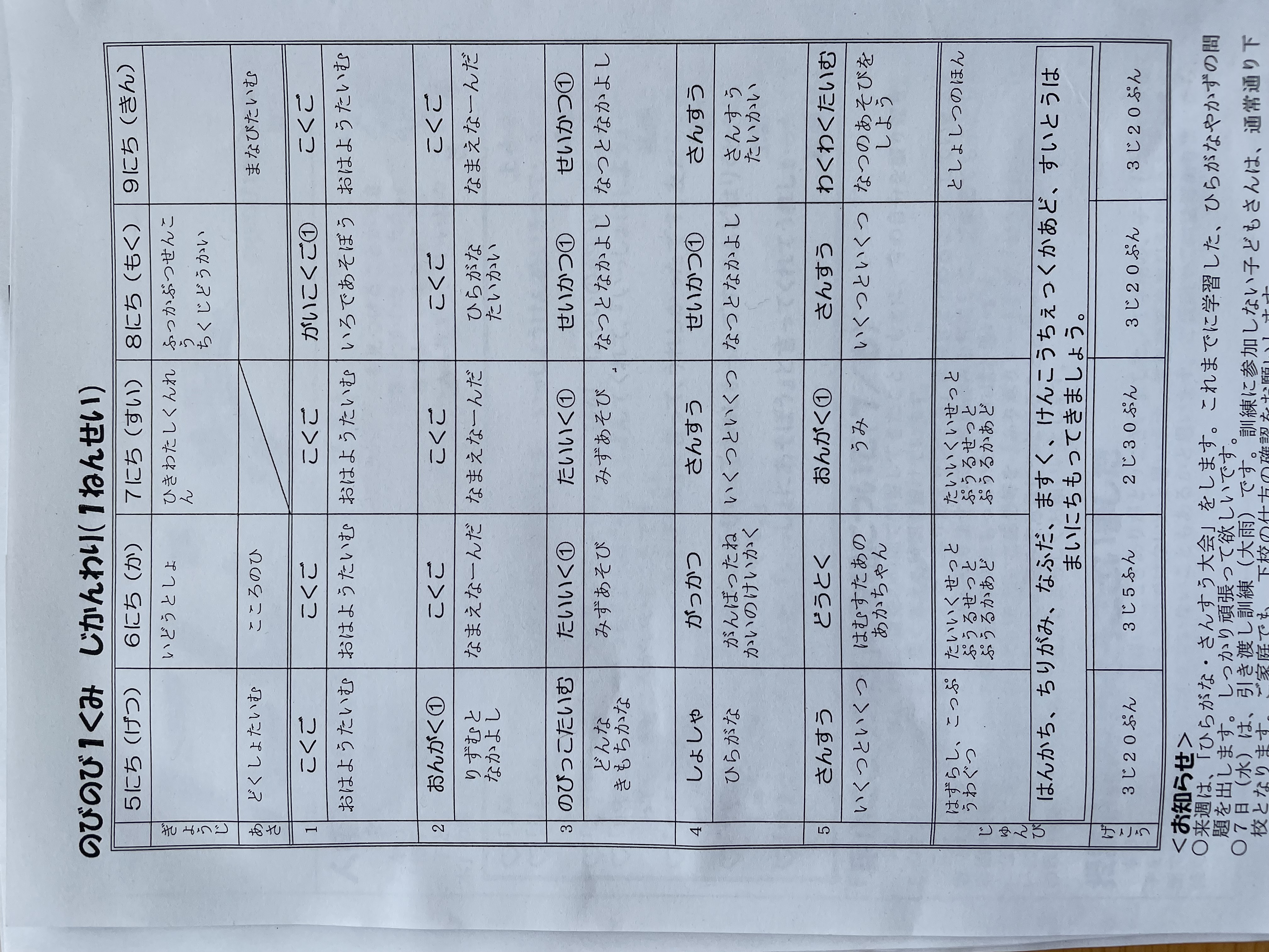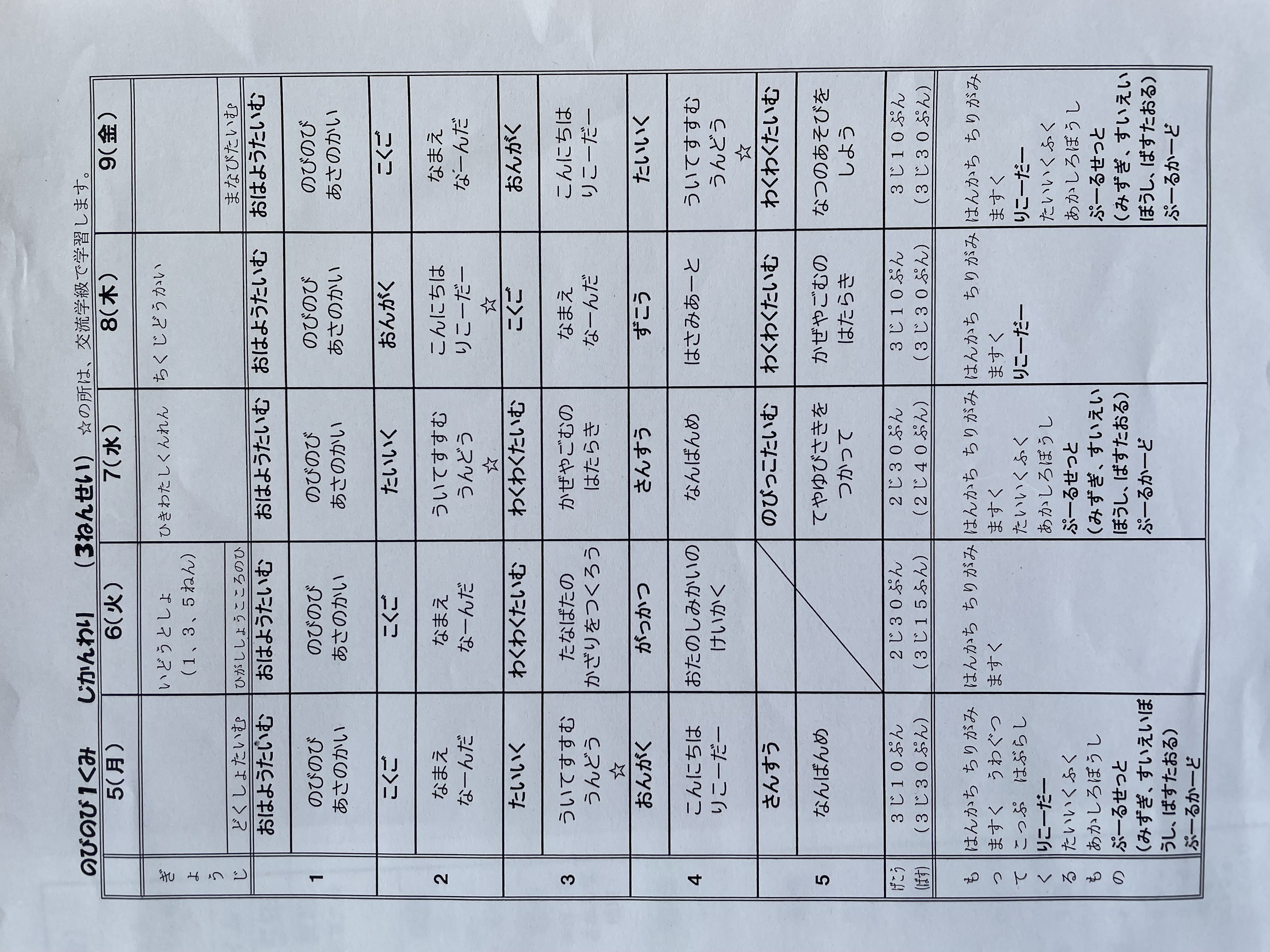 7月5日~7月9日までの時間割 投稿日時 : 2021/07/05 学校サイト管理者 1年1組.JPG 1年2組.JPG 2年1組.JPG 3年1組.JPG 4年1組.JPG 5年1組.JPG 5年2組.JPG 6年1組.JPG の1組1年.JPG の1組3年.JPG の1組5年・6年.JPG の2組4年・5年.JPG の3組1年.JPG の3組2年.JPG の3組3年.JPG の3組5年.JPG