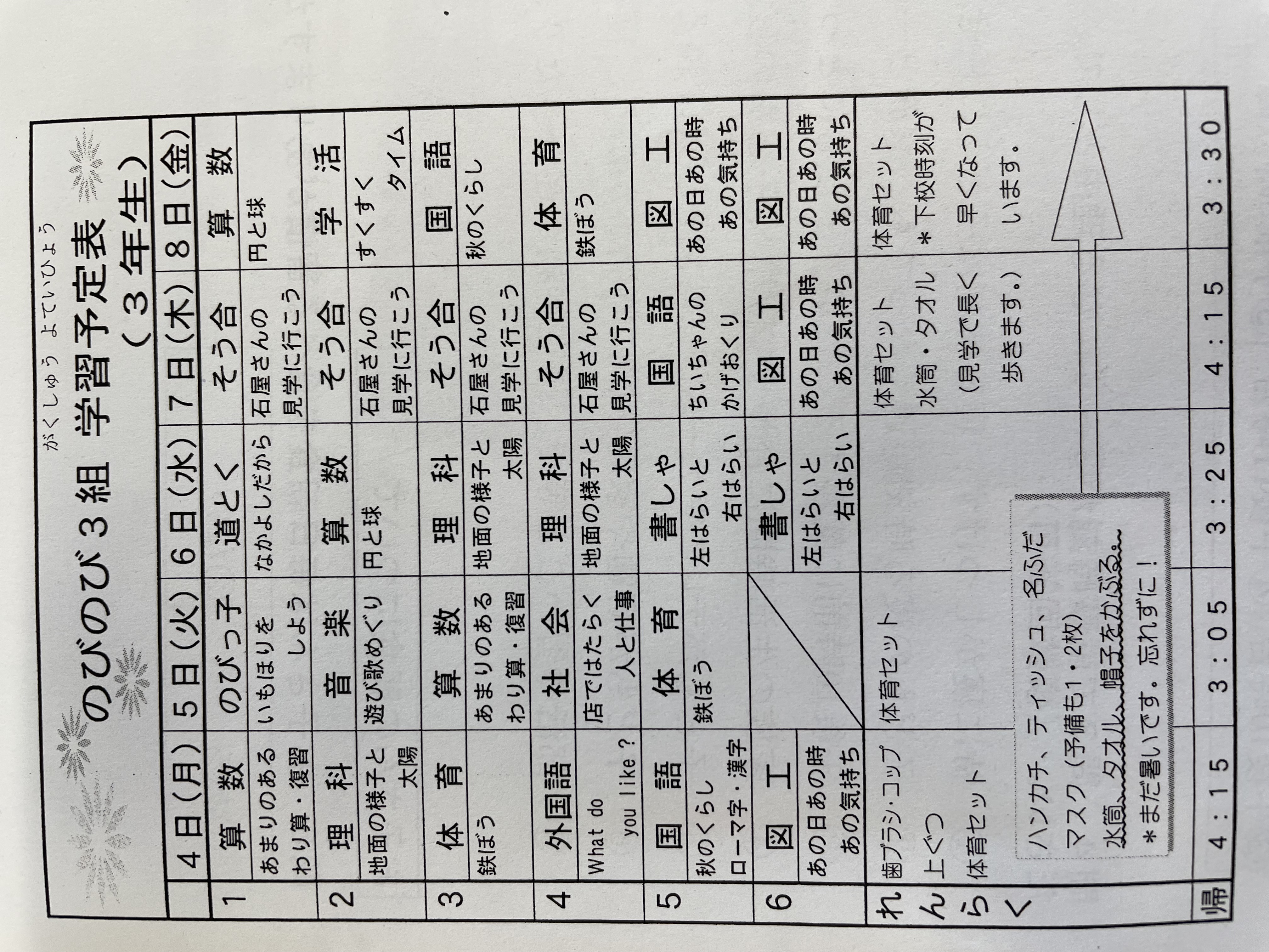 10月4日~10月8日までの時間割 投稿日時 : 2021/10/04 学校サイト管理者 1年1組.JPG 1年2組.JPG 2年1組.JPG 3年1組.JPG 4年1組.JPG 5年1組.JPG 5年2組.JPG 6年1組.JPG の1組1年.JPG の1組3年.JPG の1組5年・6年.JPG の2組4年・5年.JPG の3組1年.JPG の3組2年.JPG の3組3年.JPG の3組5年.JPG