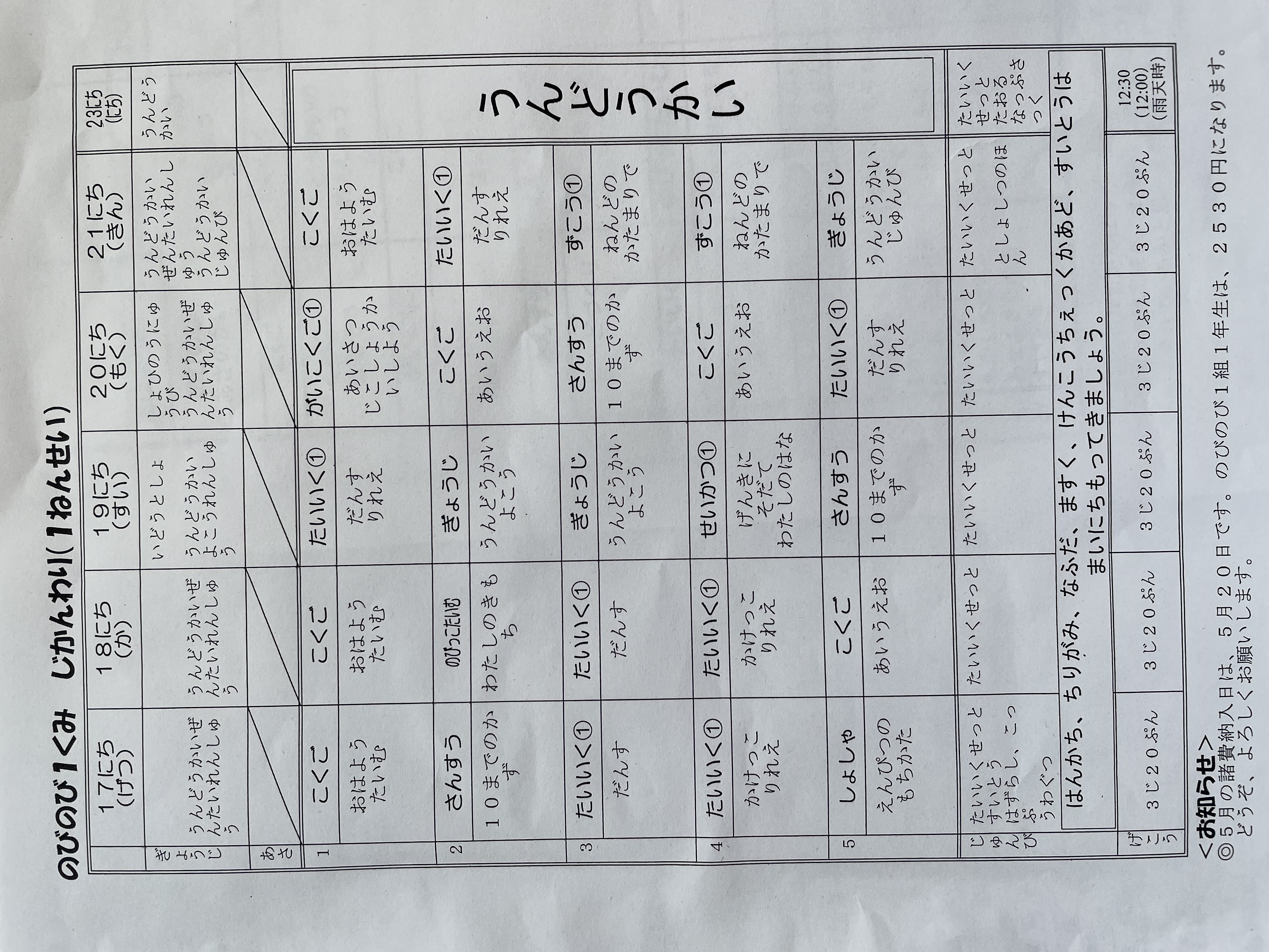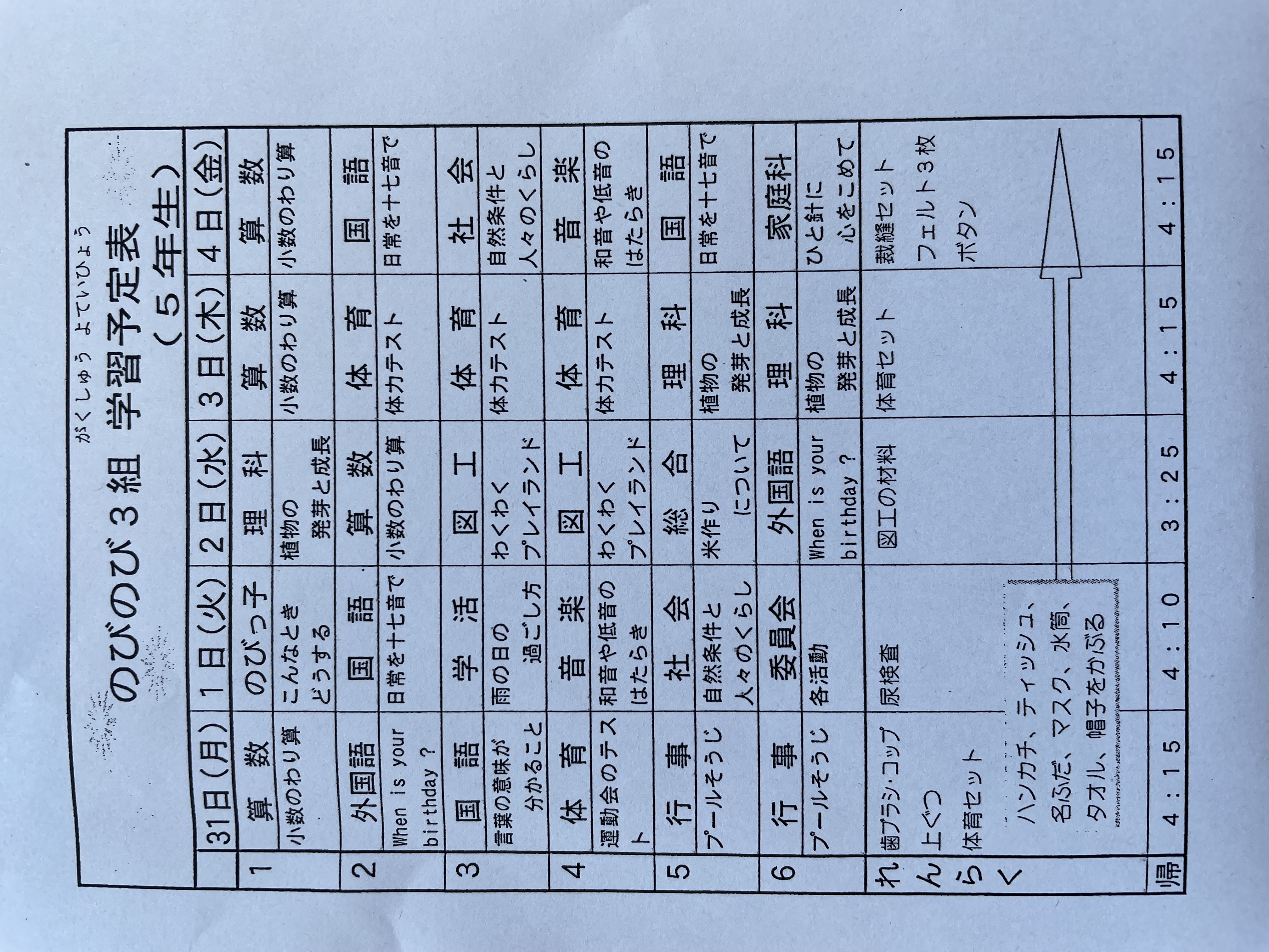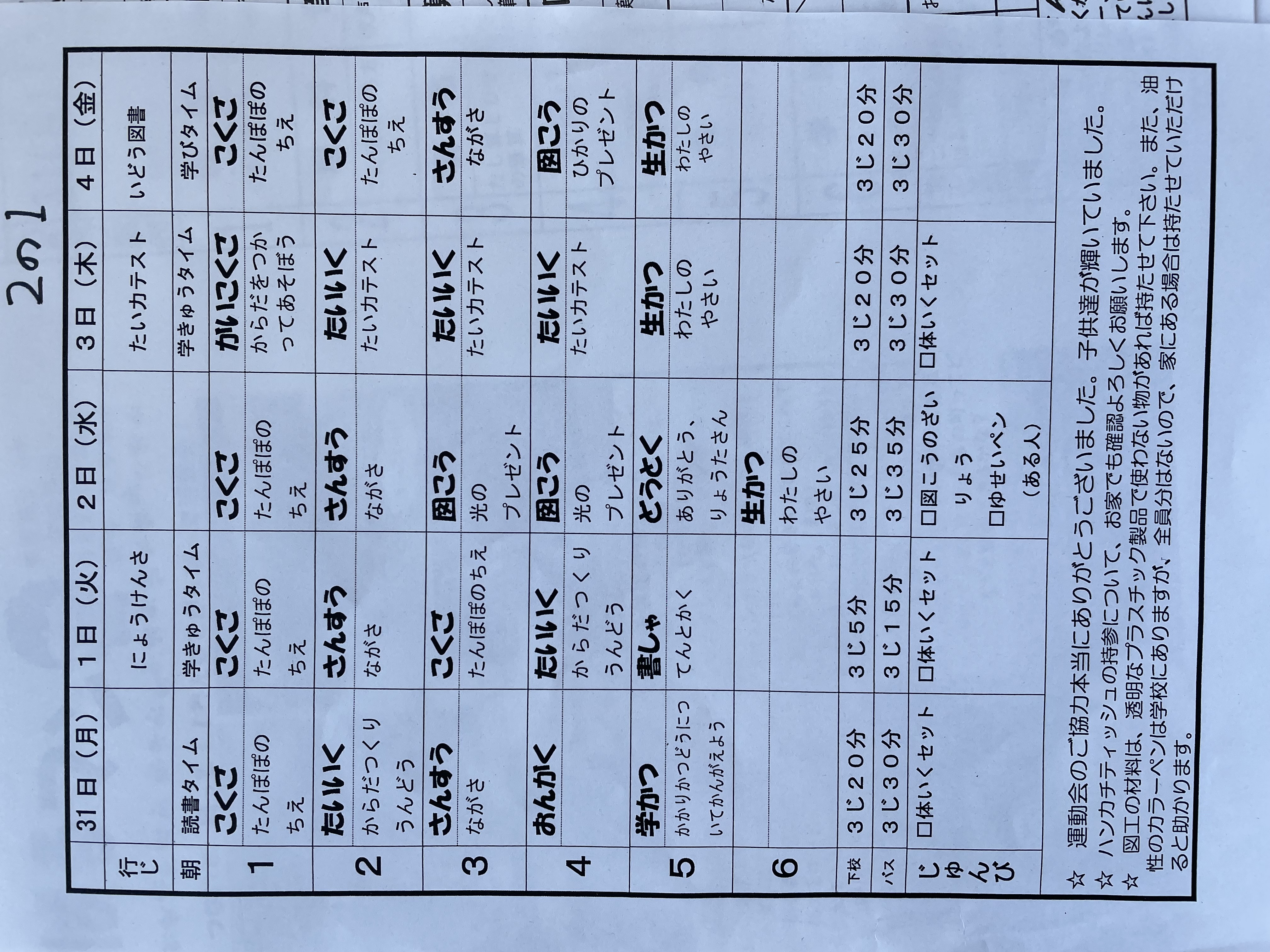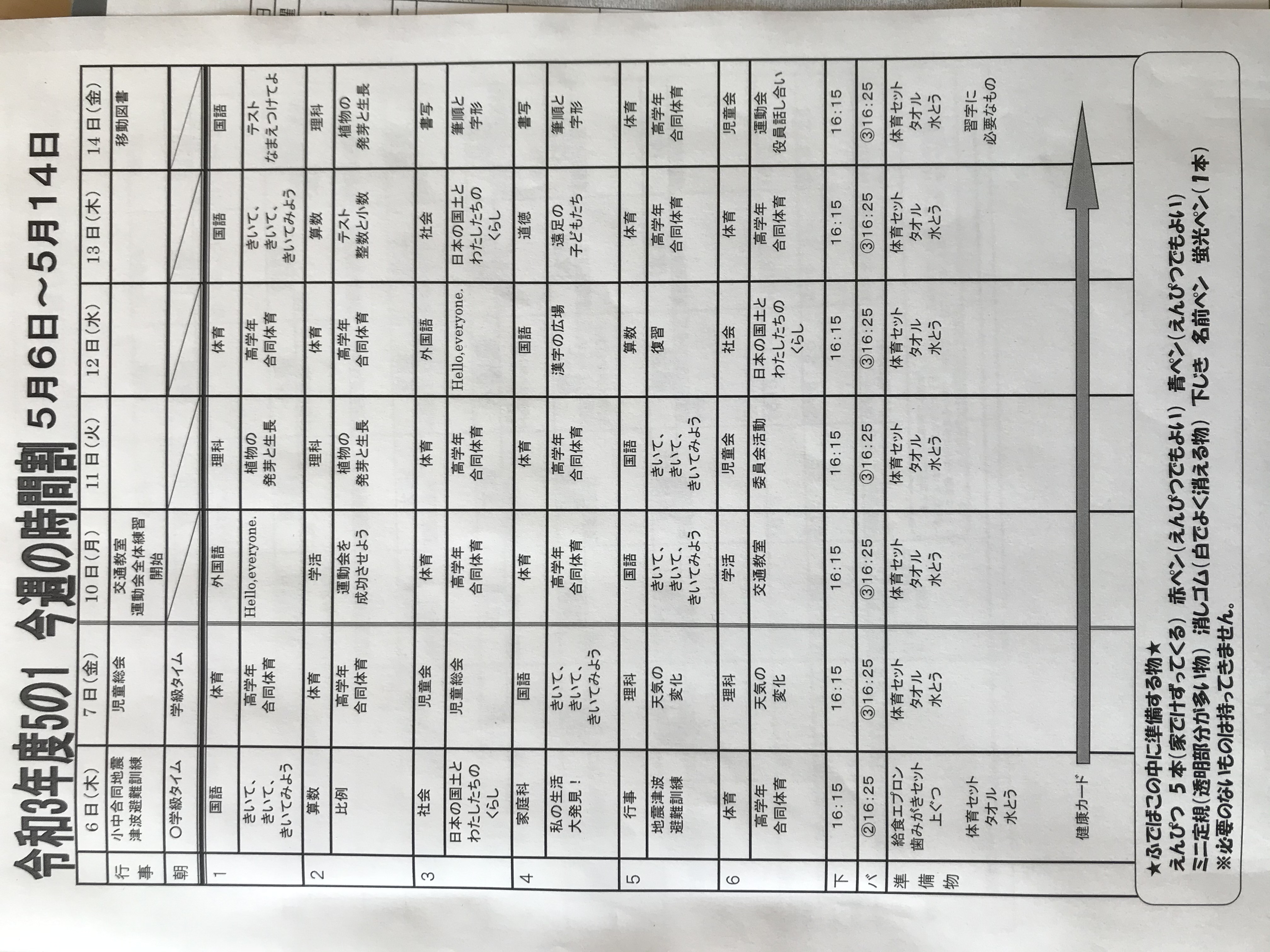 5月25日~28日までの時間割 投稿日時 : 2021/05/27 学校サイト管理者 1年1.JPG 1年2組.JPG 2年1組.JPG 3年1組.JPG 4年1組.JPG 5年1組.JPG 5年2組.JPG 6年1組.JPG の1組1年.JPG の1組3年.JPG の1組5・6年.JPG の2組4・5年.JPG の3組1年.JPG の3組2年.JPG の3組3年.JPG の3組5年.JPG