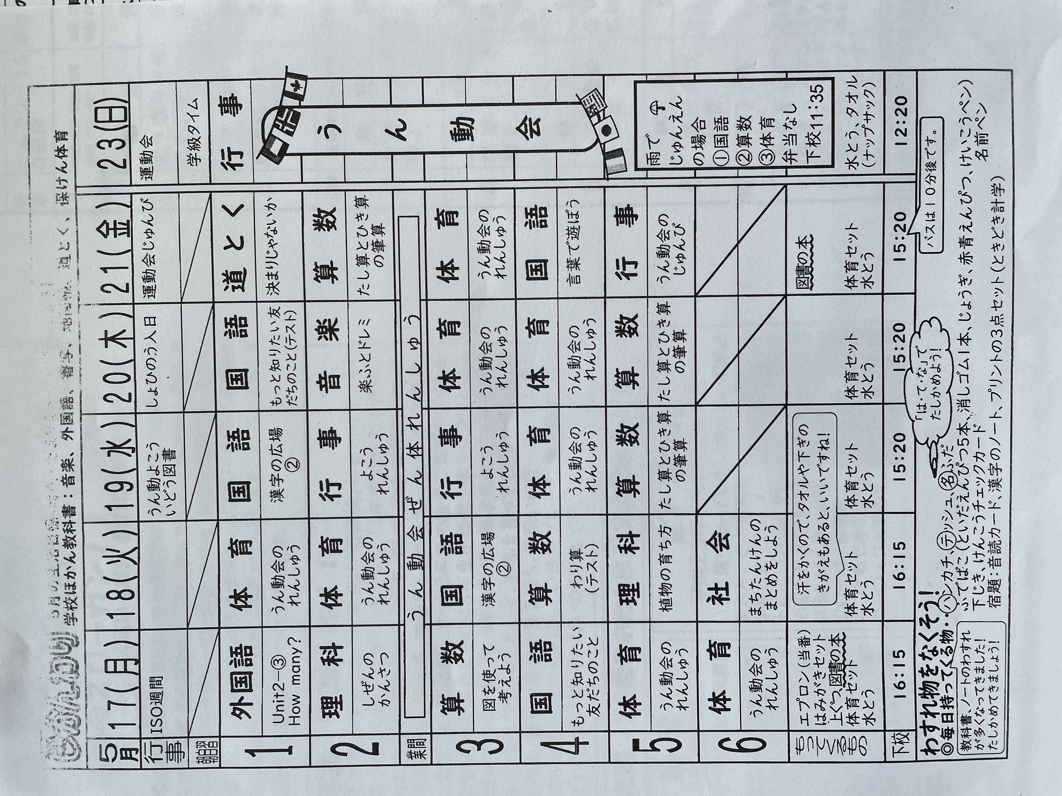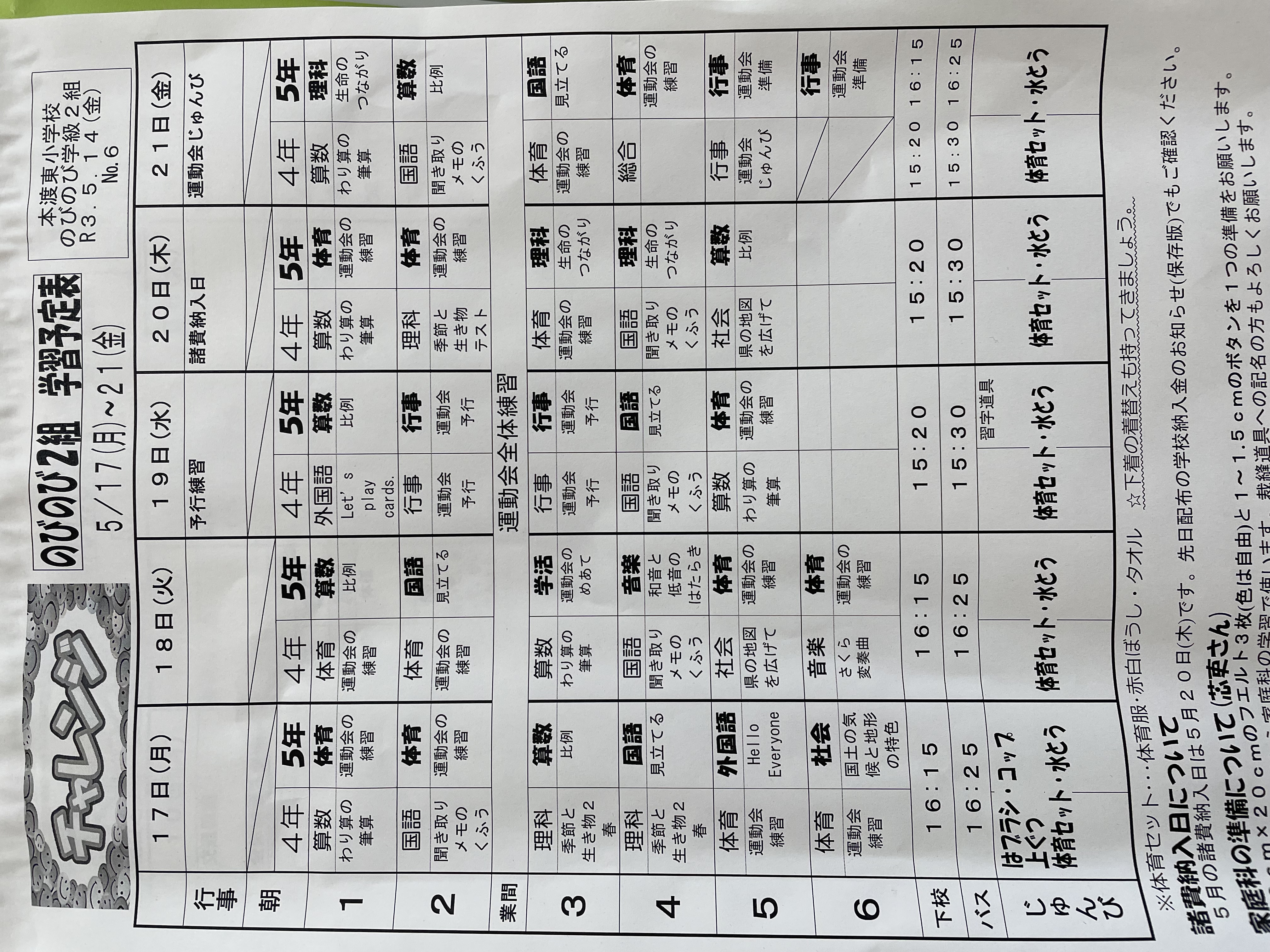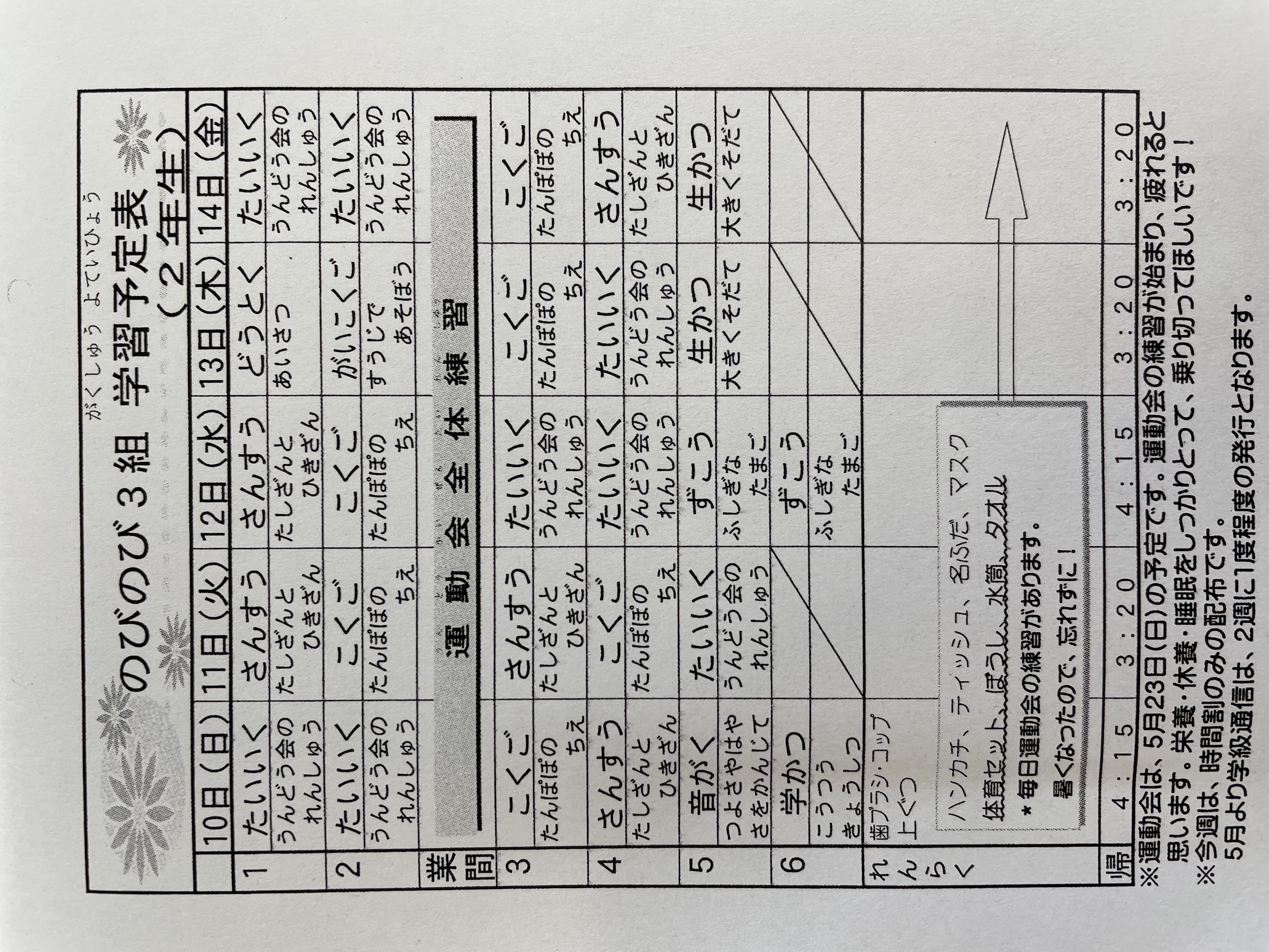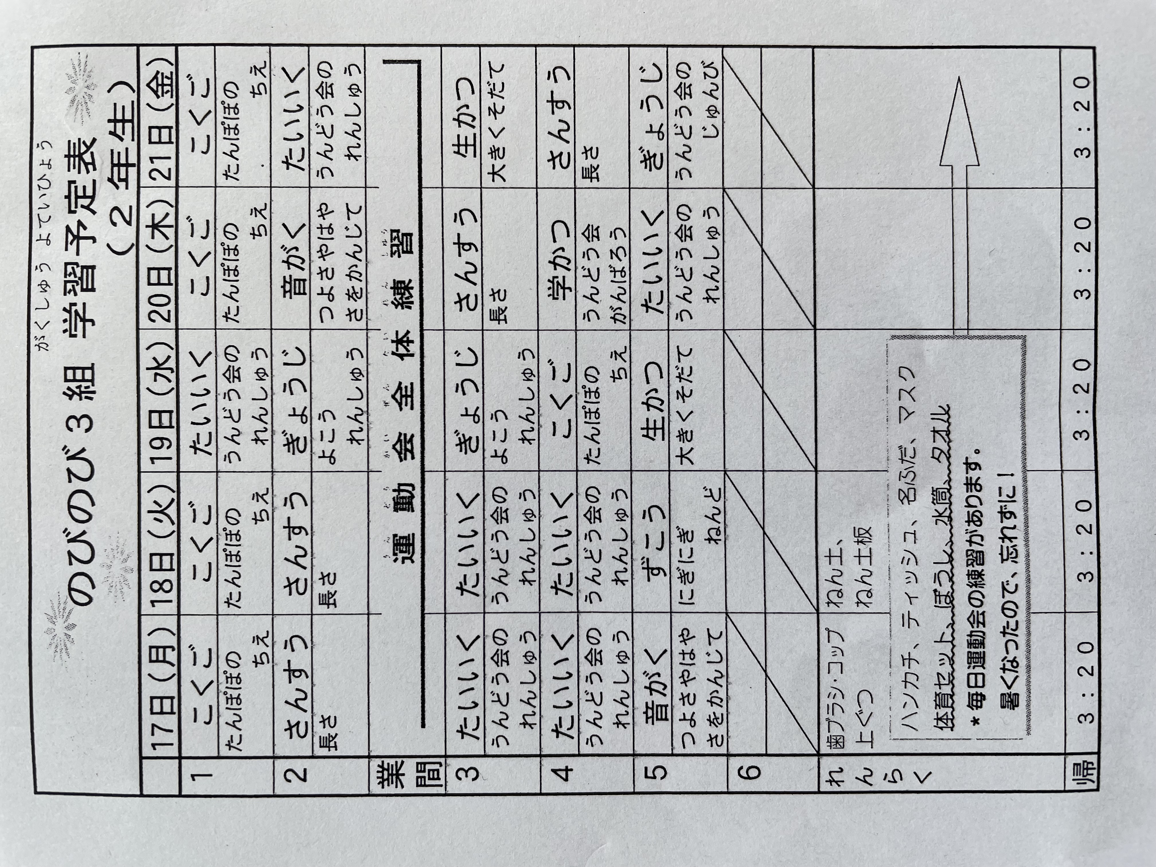 5月6日~5月7日までの時間割 投稿日時 : 2021/05/06 学校サイト管理者 1年1組.JPG 1年2組.JPG 2年1組.JPG 3年1組.JPG 4年1組.JPG 5年1組.JPG 5年2組.JPG 6年1組.JPG の1組1年.JPG の1組3年.JPG の1組5・6年.JPG の2組4・5年.JPG の3組1年.JPG